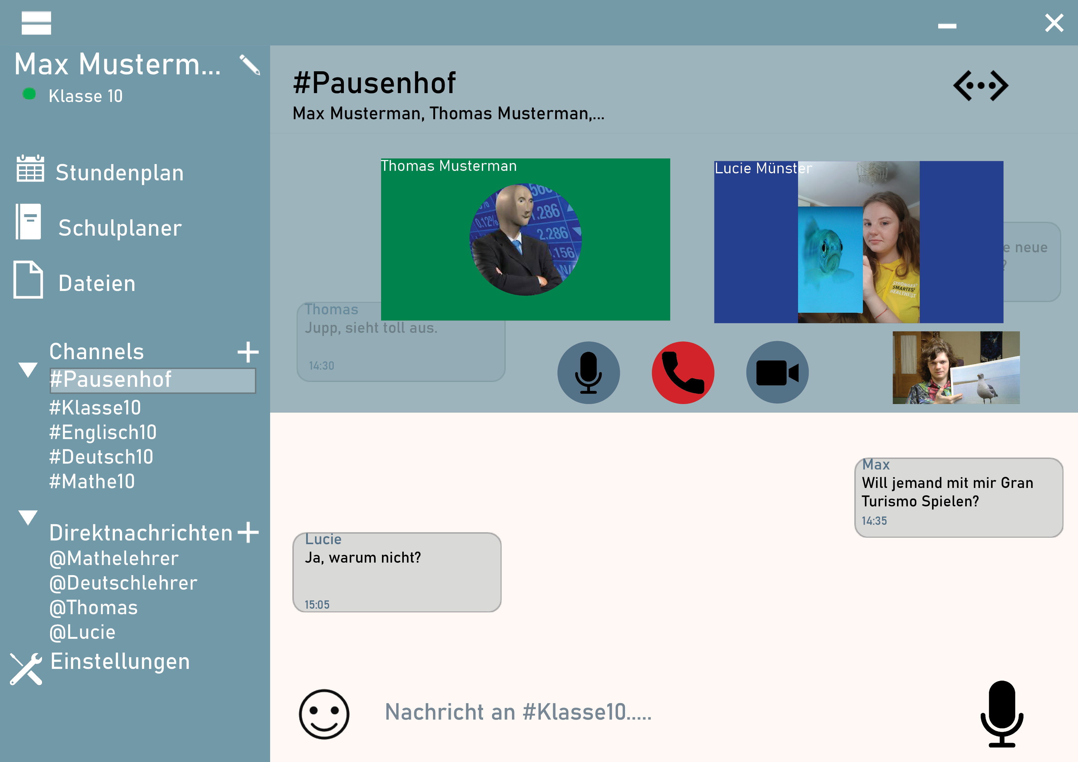 Unsere Antwort ist der "Digitale Pausenhof". "Der digitale Pausenhof" ist eine Software, die das Lernen erleichtert und den Lernprozess leichter organisieren lässt. Es ist eine einzigartige Software, die für Schülerinnen, Schüler und ihre Lehrer speziell konzipiert ist. Um die App zu verwenden, braucht man keine große MNT-Kompetenzen. In Classenchannels besprechen die Schüler den Unterrichtsstoff mit Lehrer und miteinander. Der Pausenhof ist ein digitales Ort, wo man mit Freunden erholen kann. Es gibt außerdem einen Stundenplan mit allen wichtigen Themata und Termine. In den Schulplaner werden die Hausaufgaben automatisch hinzugefügt und es wird auch die Abgabezeit angezeigt.