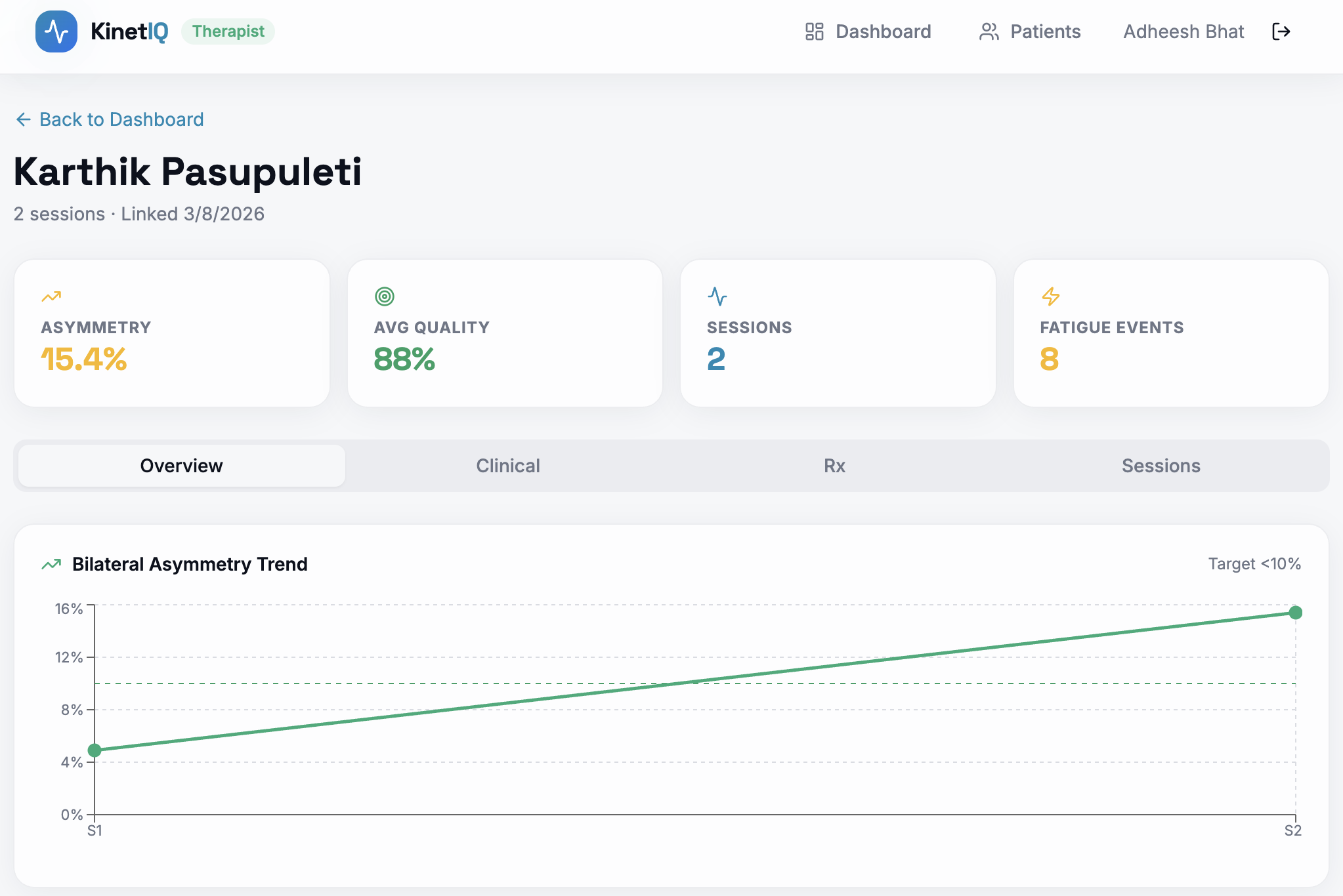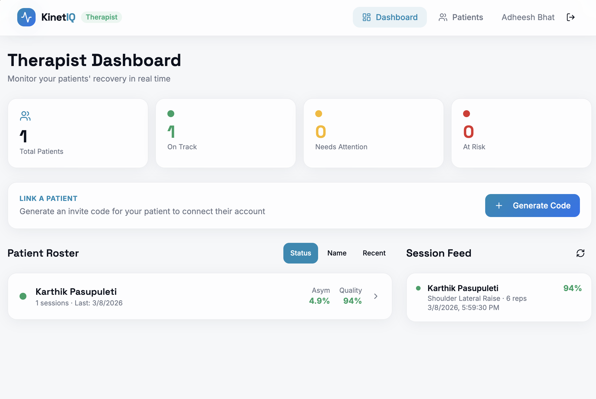 KinetIQ is a webcam-based rehabilitation supervision platform with two user roles: