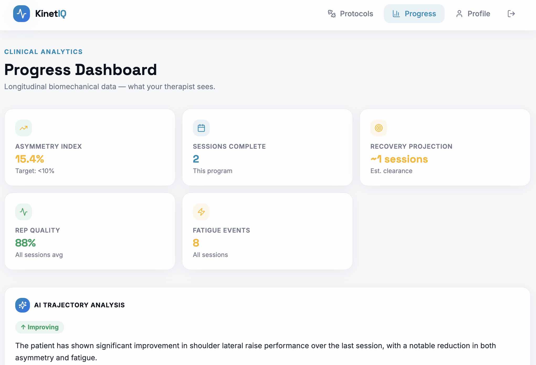 - Session-by-session rep quality breakdown (correct / compensated / incomplete stacked bar)