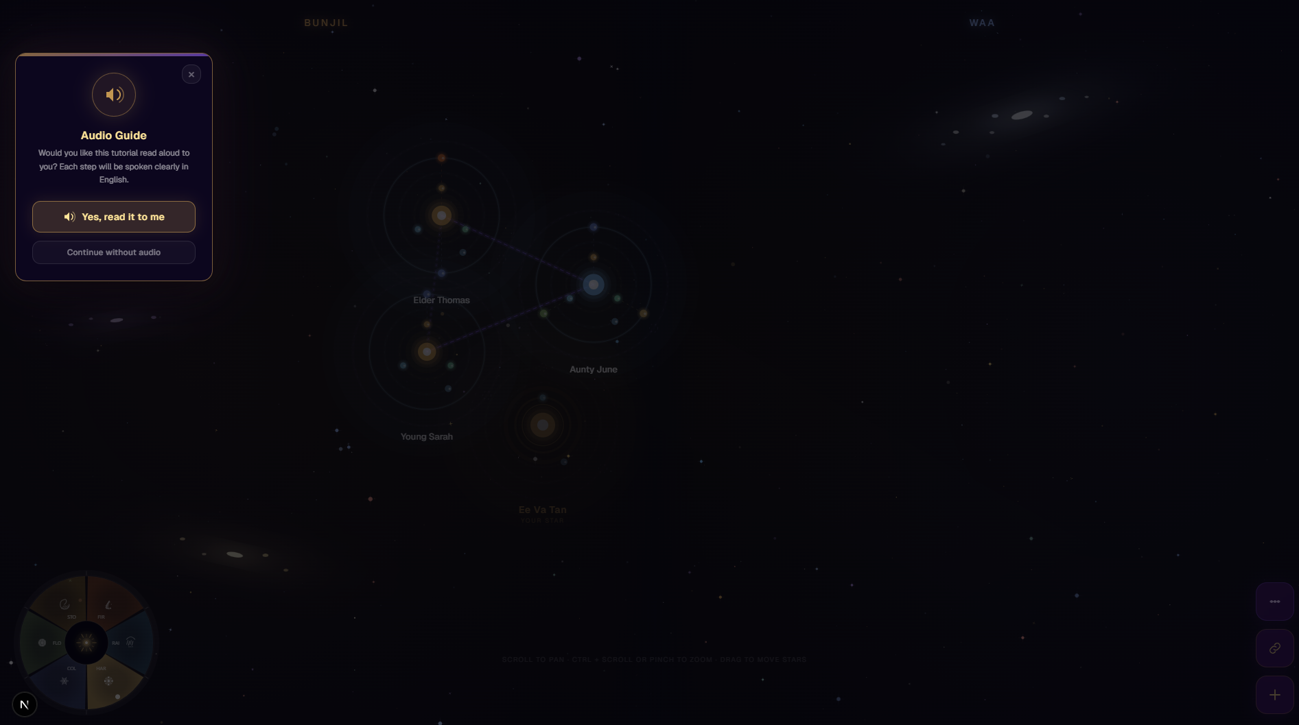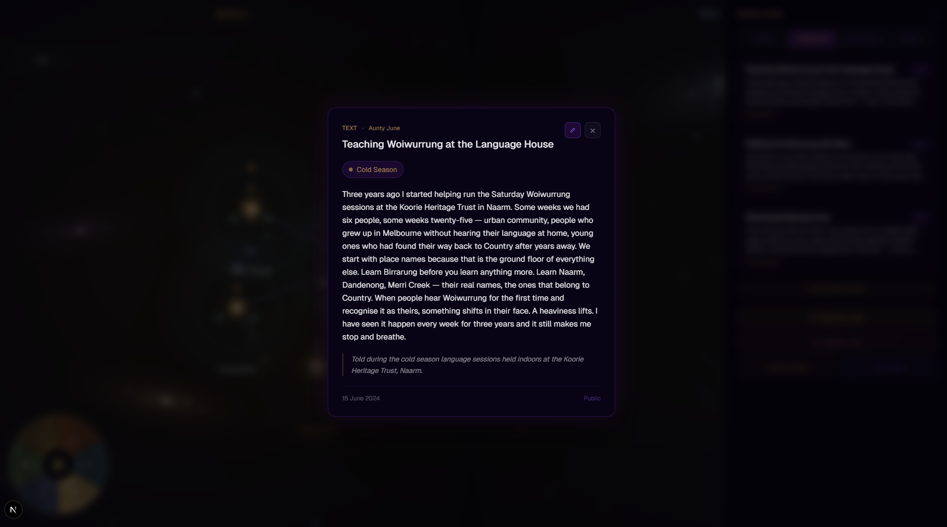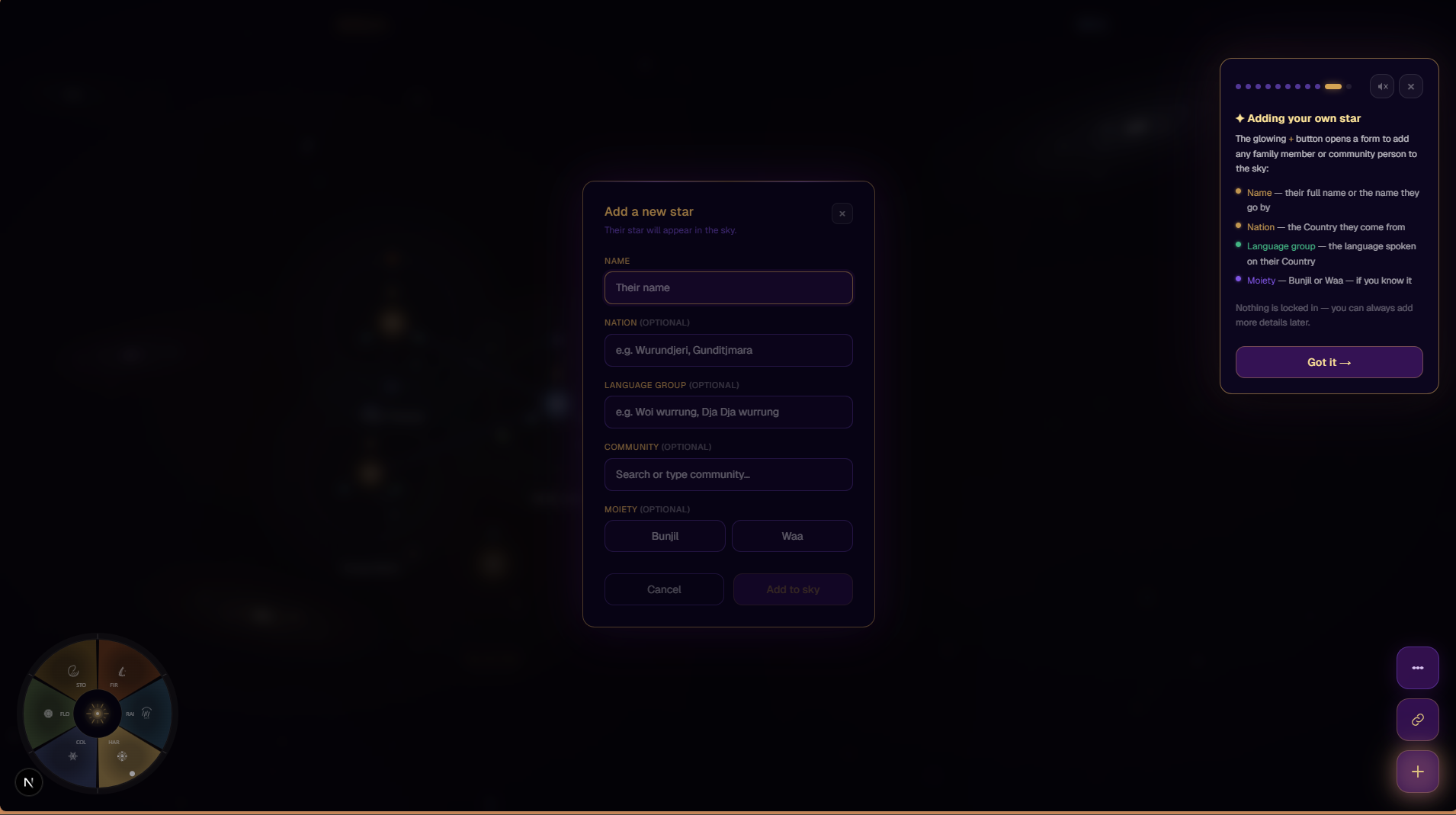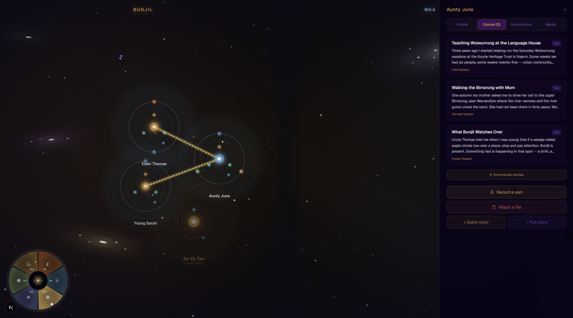 Kinstellation is our attempt to honour Aboriginal knowledge systems and offer a tool for storytelling, kinship mapping, and cultural preservation, while acknowledging that true cultural ownership must remain with community members and Elders.