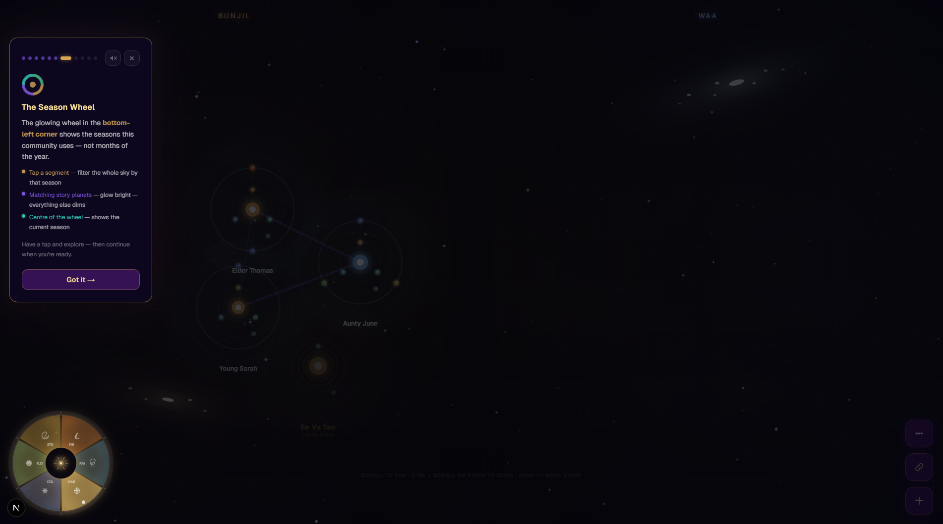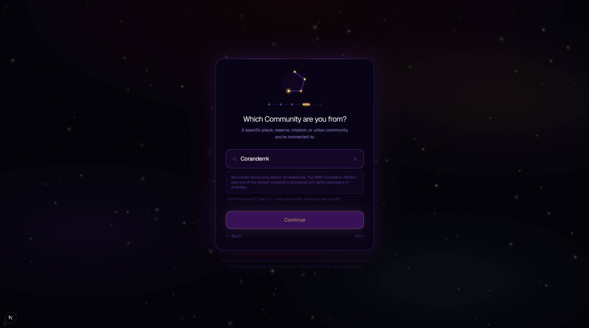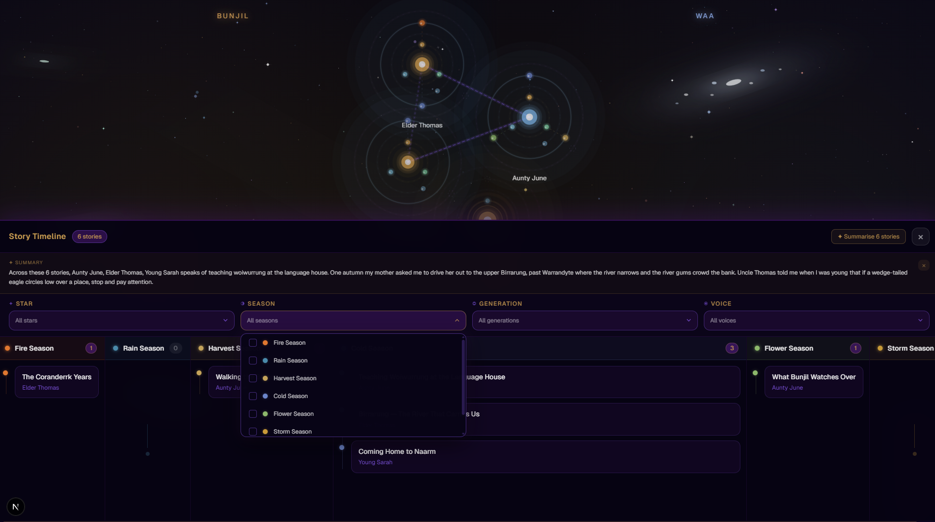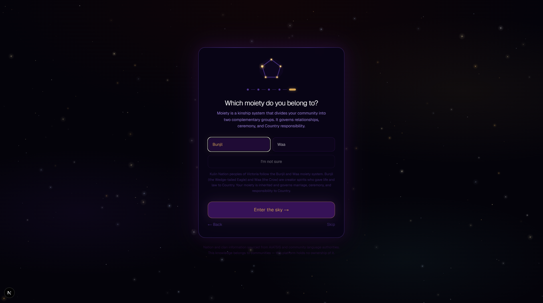 Kinstellation is our attempt to honour Aboriginal knowledge systems and offer a tool for storytelling, kinship mapping, and cultural preservation, while acknowledging that true cultural ownership must remain with community members and Elders.