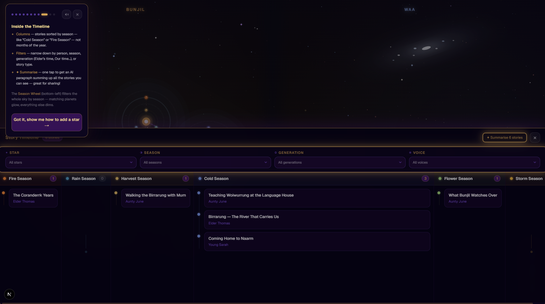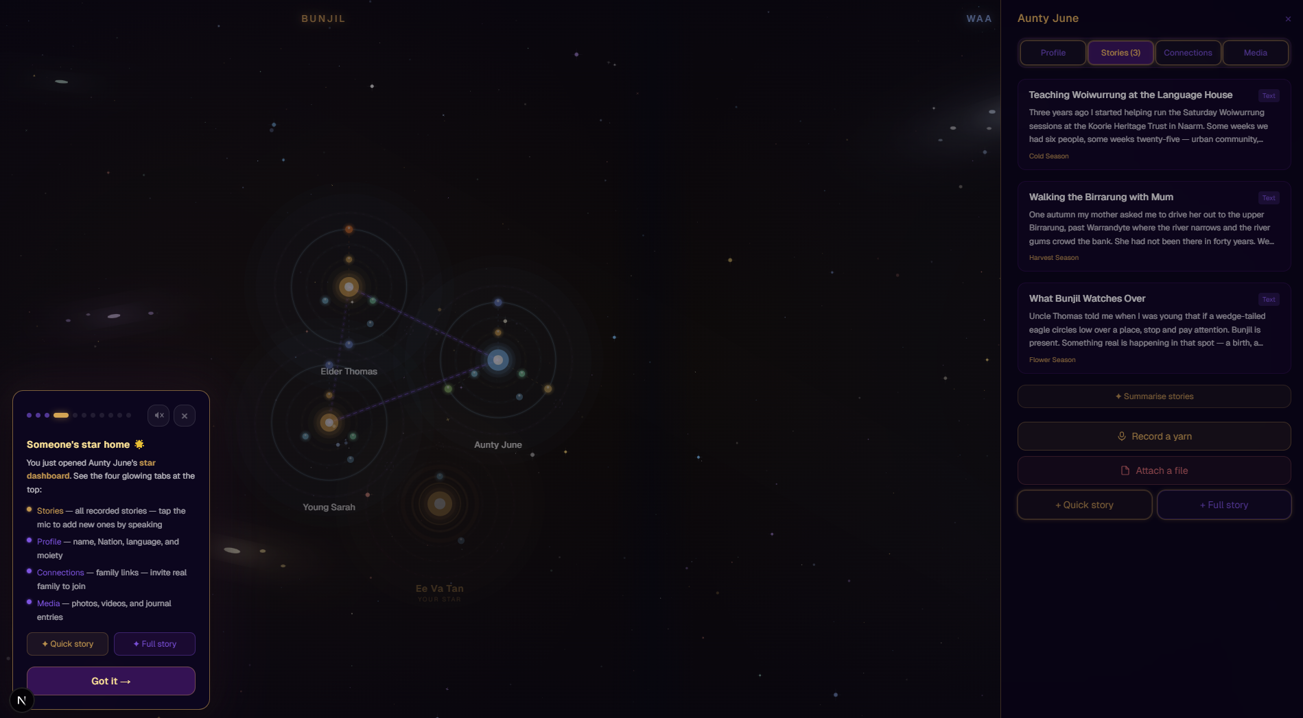 Kinstellation is a kinship-based oral history and storytelling platform designed for Aboriginal communities in Australia, but due to time constraints the prototype scope was limited to Aboriginal communities in Victoria. It allows users to: