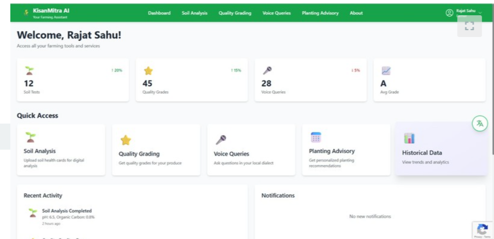 🎤 Voice Assistant (Krishi-Vani): Farmers can ask questions in their local language and get instant answers. 📸 Quality Grader: Upload crop images to get quality grading and price estimation. 🌱 Soil Analyzer (Dhara): Scan soil health cards and receive fertilizer recommendations. 🌾 Sowing Advisor: Get crop suggestions, planting time, and yield predictions. 📊 Real-time Insights: Access mandi prices, weather forecasts, and market trends. 🛠️ How we built it