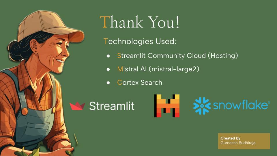 I learned a lot about building RAG applications using tools and products offered by Snowflake, working with the Mistral model, and deploying apps on Streamlit Community Cloud. I also gained a deeper understanding of the challenges faced by farmers and the potential of technology to empower them.