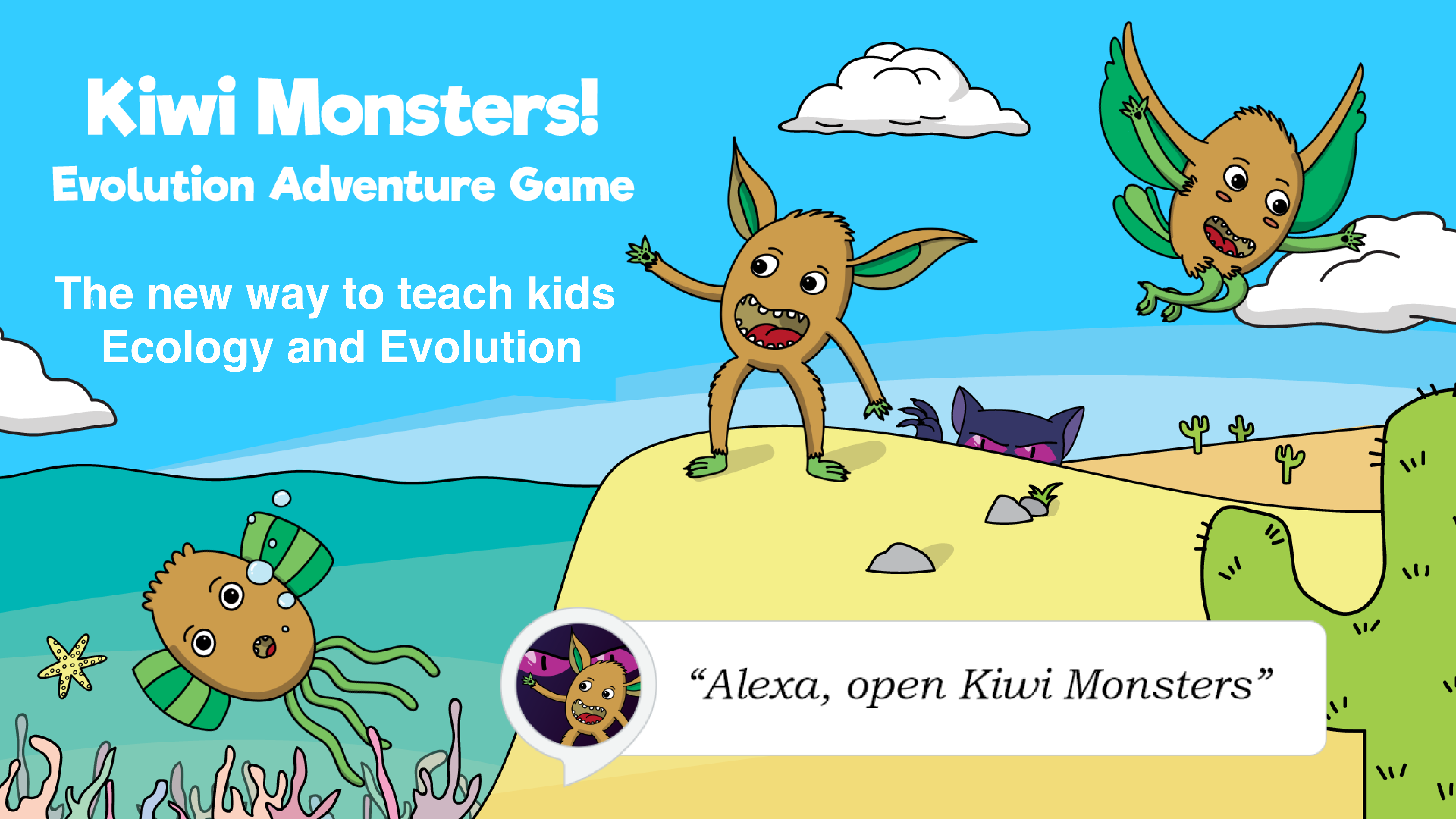 Kiwi Monsters is an interactive adventure game. In it, you will embark on a mission to planet Fruit-O and study the ecology and evolution of the monsters. Evolvobot (the voice of Alexa) will guide you on your mission by presenting you with possible choices along the way. You will decide which group to follow — for instance, the group that burrows into the ground or the one that hides in caves. Throughout the game, the Kiwi Monsters will evolve. They might grow wings, fins or even hammers on their heads! Expect funny sound effects that make you feel as if you are right there with the monsters.