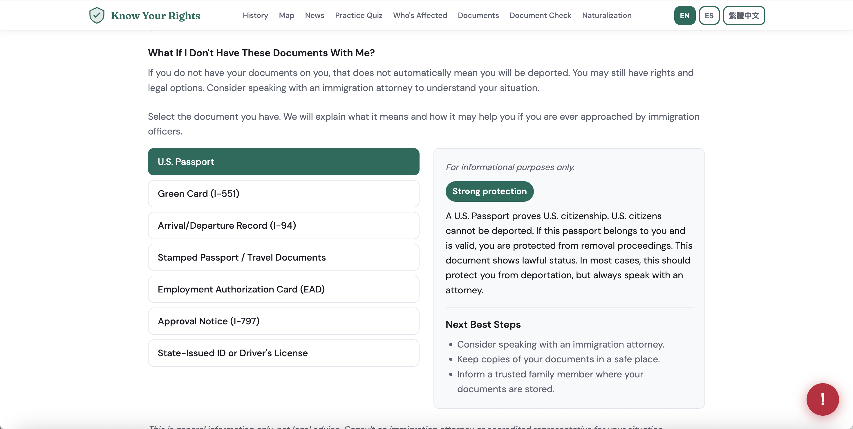 One of the biggest challenges was balancing clarity with responsibility. Immigration law is complex and highly situational. We had to be careful not to oversimplify in a way that could mislead users, while still making the interface usable in moments of panic.