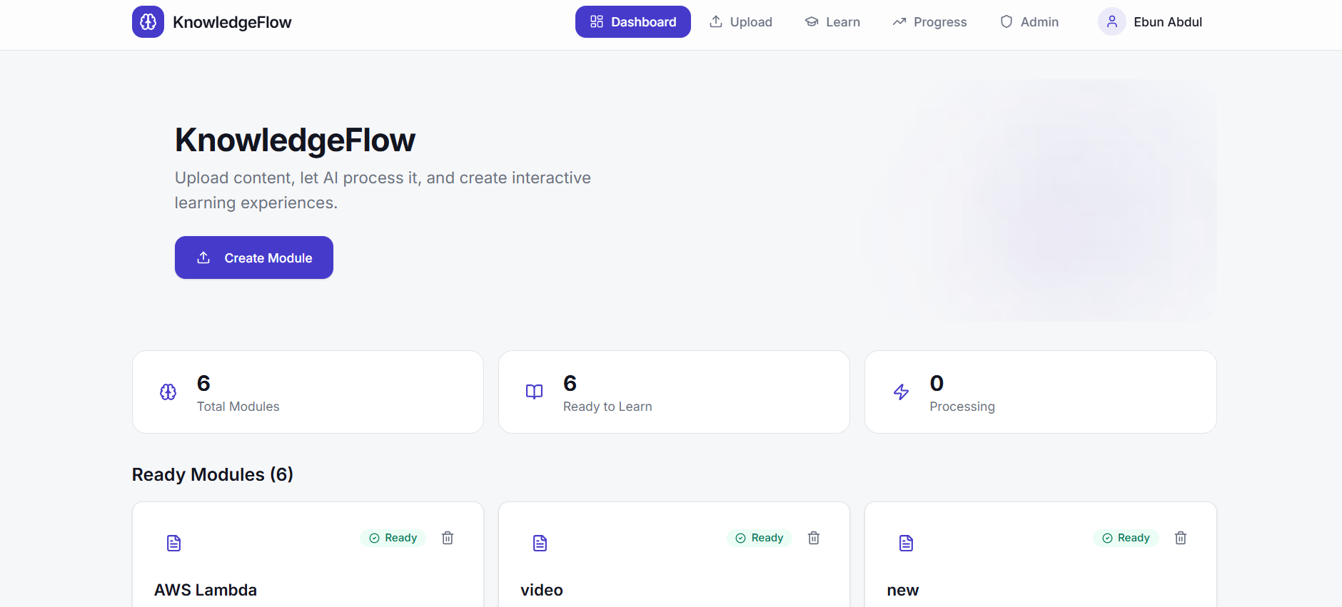 Teachers/Admins to upload files (documents, recordings, etc.) and manage access AI to extract and organize content into: summaries step-by-step guides key concepts flashcards quizzes Learners to: study structured content track their progress interact through an AI chat grounded in the uploaded knowledge