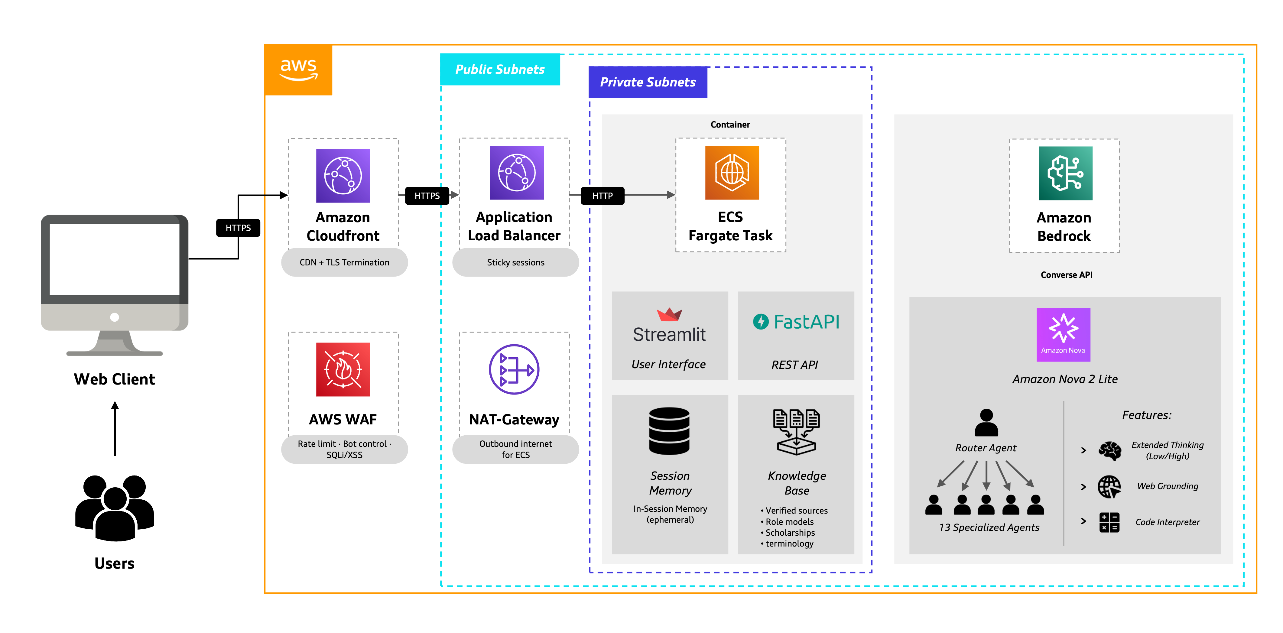 | Deployment | AWS ECS Fargate behind CloudFront + WAF |