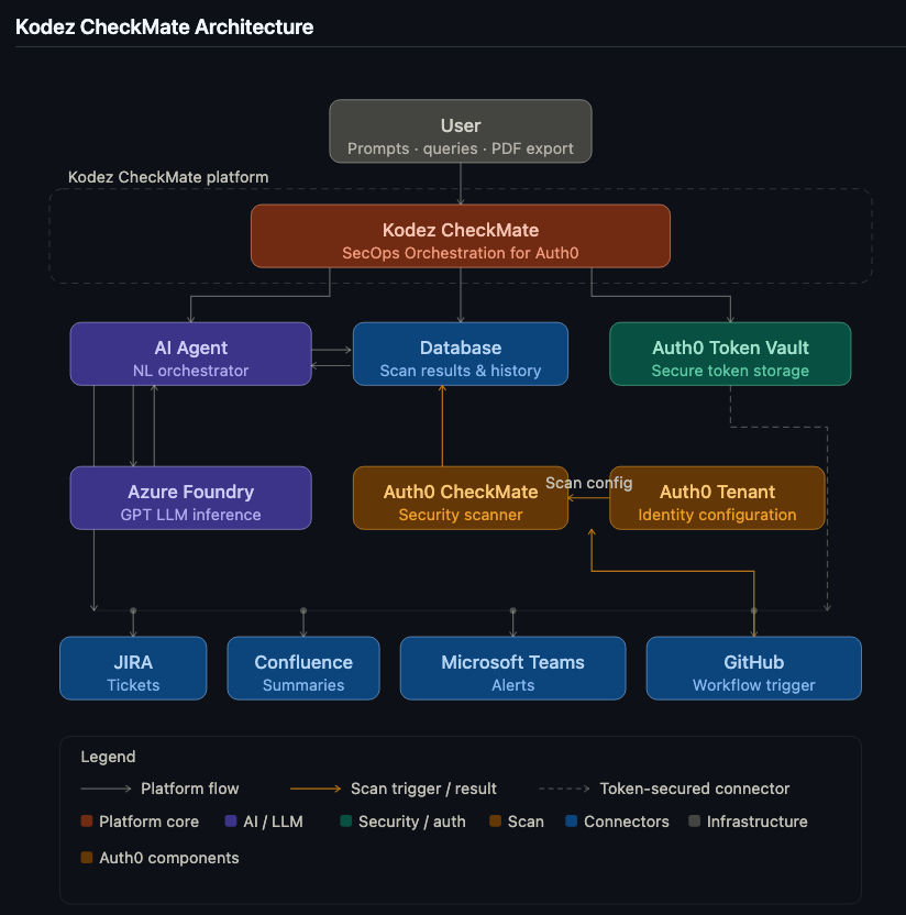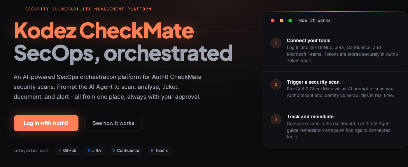 Kodez CheckMate is an AI-powered SecOps orchestration platform that takes Auth0 CheckMate security scans from raw results to tracked, documented, and actioned findings — driven entirely by natural language prompts.