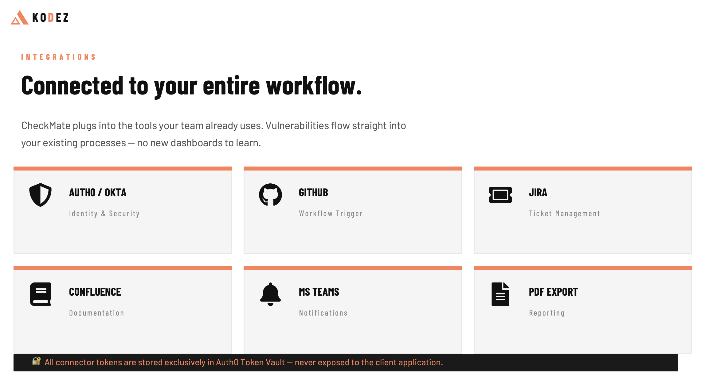 Kodez CheckMate is available now. Log in with your Auth0 account to connect your integrations and run your first scan.
