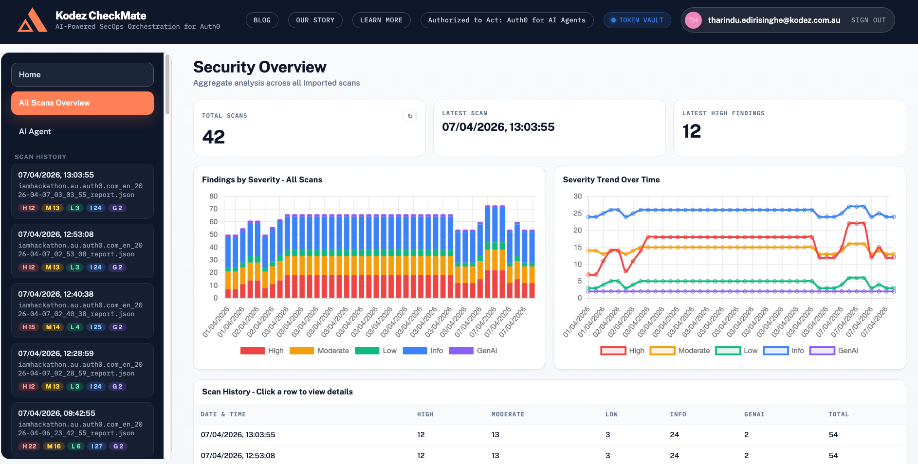Kodez CheckMate is built to close that gap. It is an AI-powered SecOps orchestration platform that takes Auth0 CheckMate security scans from raw results to tracked, documented, and actioned findings, driven entirely by natural language prompts.