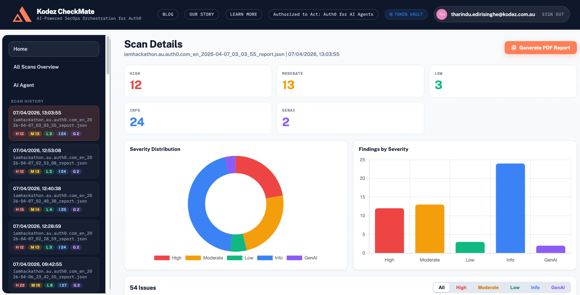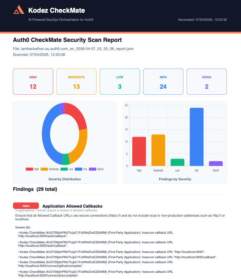 For teams that need formal documentation, Kodez CheckMate includes a PDF export capability that goes beyond the default Auth0 CheckMate report. The exported reports are structured for clarity with organised findings, severity breakdowns, remediation recommendations, and scan comparisons in a clean, professional format.