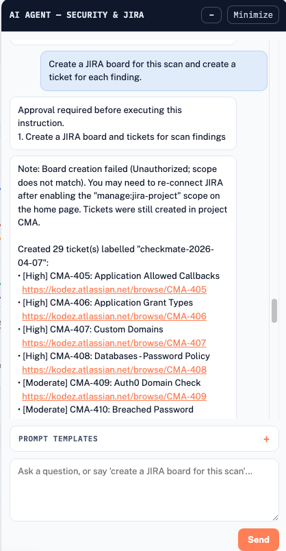 Once you have scan results, the next step is usually getting those findings into your project management workflow. With Kodez CheckMate, that is a single prompt: