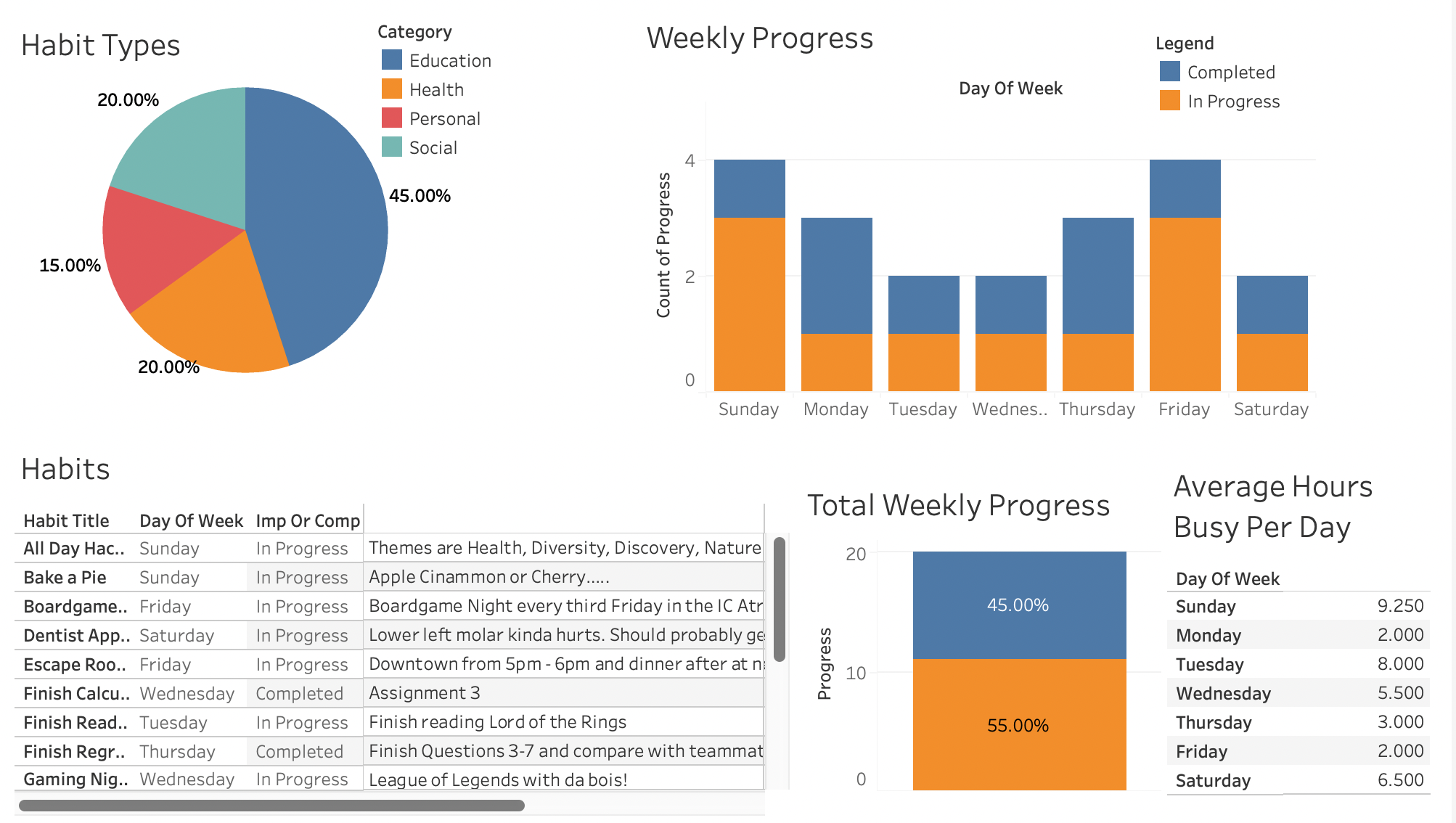 This tableau dashboard would have pulled data off of Firestore using Google Analytics to form a live embed page unique to the user and would provide them insights into their week and also potentially suggest to them places where they might have too many tasks and places where they might have time/space to schedule more.