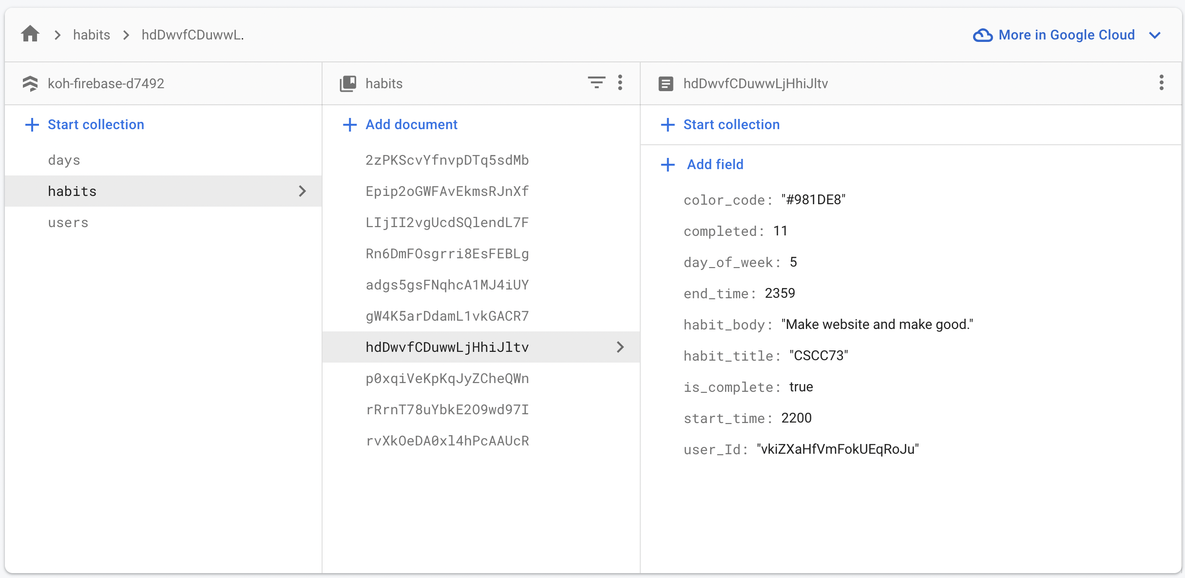 Our very first challenge, and one we kept running into, was attempting to implement something right as we were learning it, especially the Firebase Realtime Database - it felt like we didn't understand a lot of the tools we were using until much later after we had tinkered with it for hours. Unsurprisingly, it turned out that a lot of seemingly simple functionality was much harder to actually implement than it seemed on the surface. Along the same vein, we ran the huge range of avenues we could go down. While we had come in with the plan to create a habit tracker, there are many ways to approach such a topic, and narrowing our focus to what we could feasibly create and/or convincingly plan out was a slight challenge. After wrestling with the Realtime Database for 7 hours, we switched to Firebase Firestore and it worked out a lot easier.