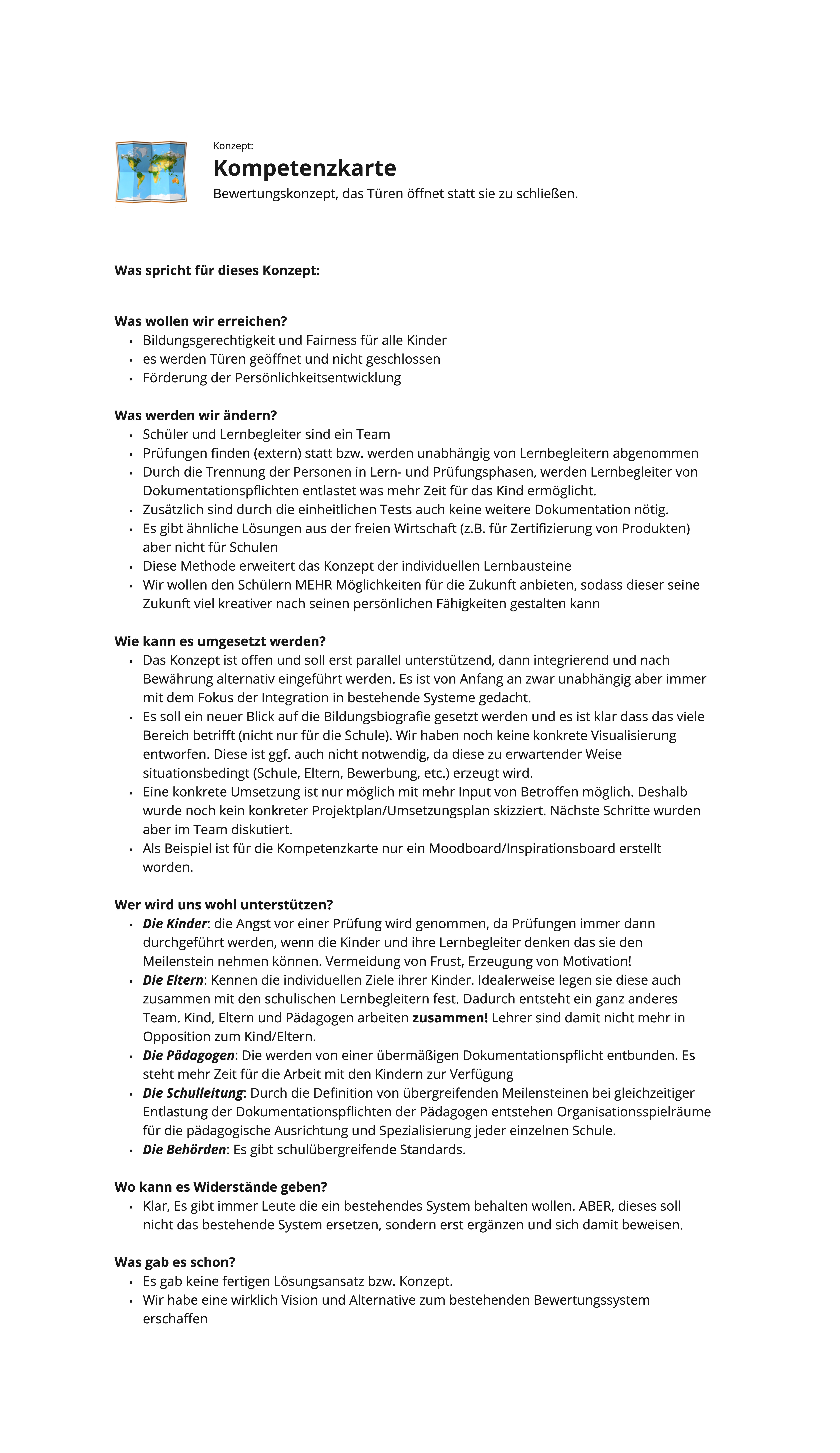 Was ist das Problem, das ihr mit eurer Lösung für die Schule von Morgen lösen/verbessern wollt?: Durch aktuelle Bewertungskultur (Arbeiten, Tests und Zeugnisse) werden die Lernenden durch einen von außen vorgegebenen Rhythmus bewertet. Dies führt insbesondere bei Lernenden, die noch nicht die Kompetenzen erworben haben zu Zeitdruck, Frust und Demotivation. Unser Konzept bricht dies auf und ermöglicht sowohl Schülern als auch Lernbegleitenden im Team selbstverantwortlich den individuell besten Lernentwicklungsweg für jedes Kind zu finden.