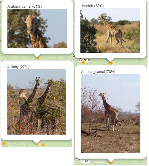 We set a bounding box for the extents of the Kruger national park. Used this mask with the Flickr API to find all of the images taken in the park over a set period of time. This then created a database with the image location, URL and title. We passed the images through a pre trained model of inception V3 using Keras with tensorflow backend in python and assigned the label to each case in the database. The locations were then plotted on a map using leaflet, after transforming the image recognition results by grouping similar animals together and filtering images where our model had estimated a low probability of correctness.