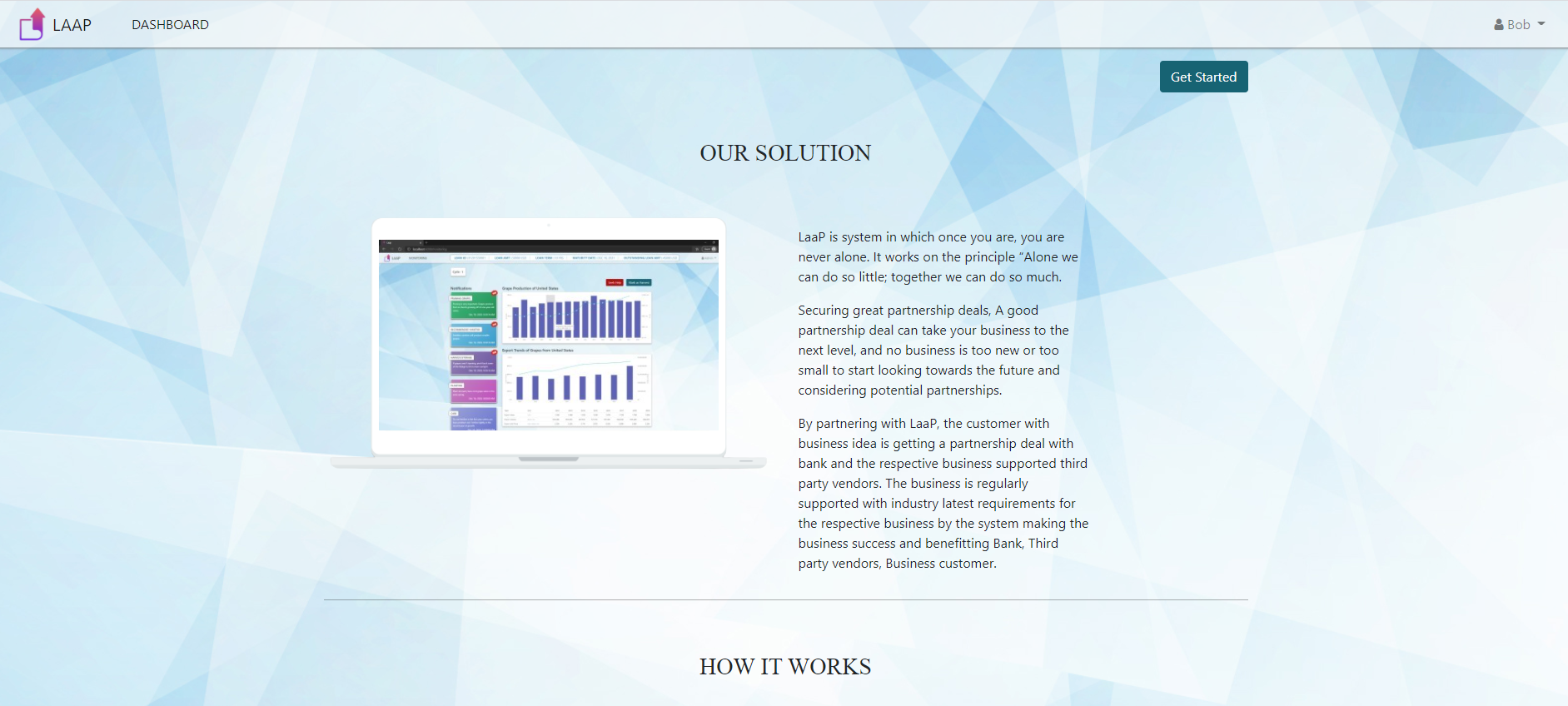 LAAP • It is a new way of looking at the whole lending process, a paradigm shift • It is not just giving out money and leave the whole business/repayment burden on borrower • Lender is investing in Borrower's business, so it is a mutual responsibility to make this business successful • LaaP provides a platform where Lender and Borrower connects to a whole array of service providers who are the backbone of the business, Market advisors, Traders, SMEs etc... • The whole idea is, Lender, Borrower and these service providers connect each other to get this business a success and thus Lender gets its investment back with interest, Borrower gets to repay the loan(investment) seamlessly through business profit
