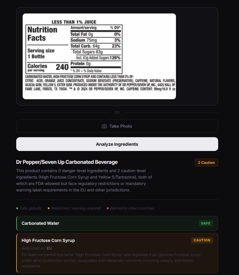 Americans trust the FDA to keep their food safe, but the FDA permits hundreds of additives that the EU, Canada, UK, Australia, and Japan have outright banned or restricted. Most people have no idea what's in their food, or that the same product sold in Europe is often made with an entirely different formula. We wanted to make that invisible information visible, instantly, just by pointing a camera at a label.