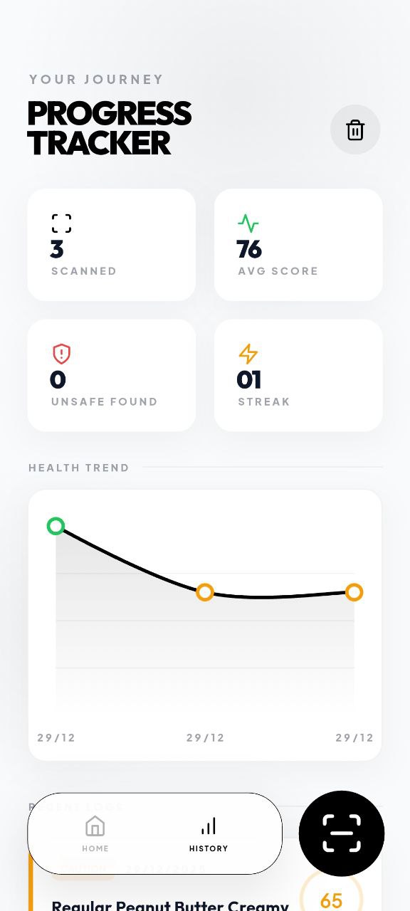 Scan food label → Analyze ingredients using AI → Generate a safety score → Show clear visual results