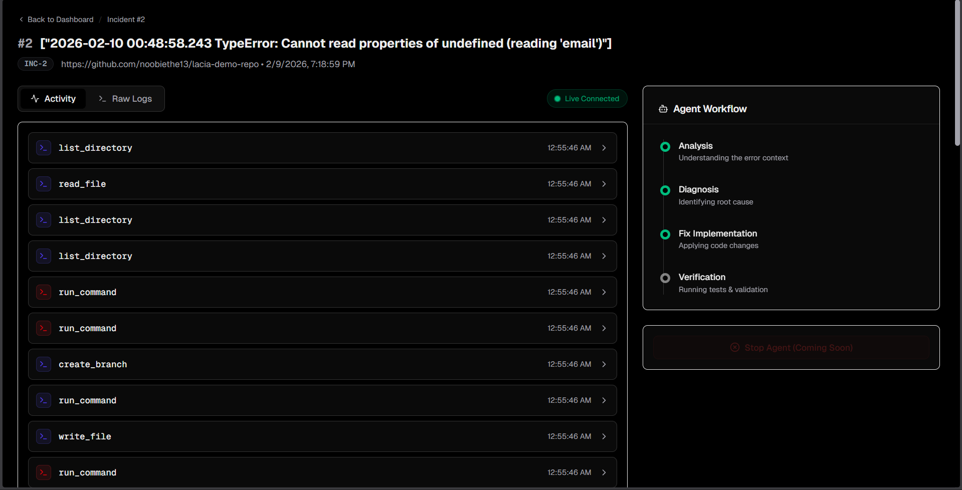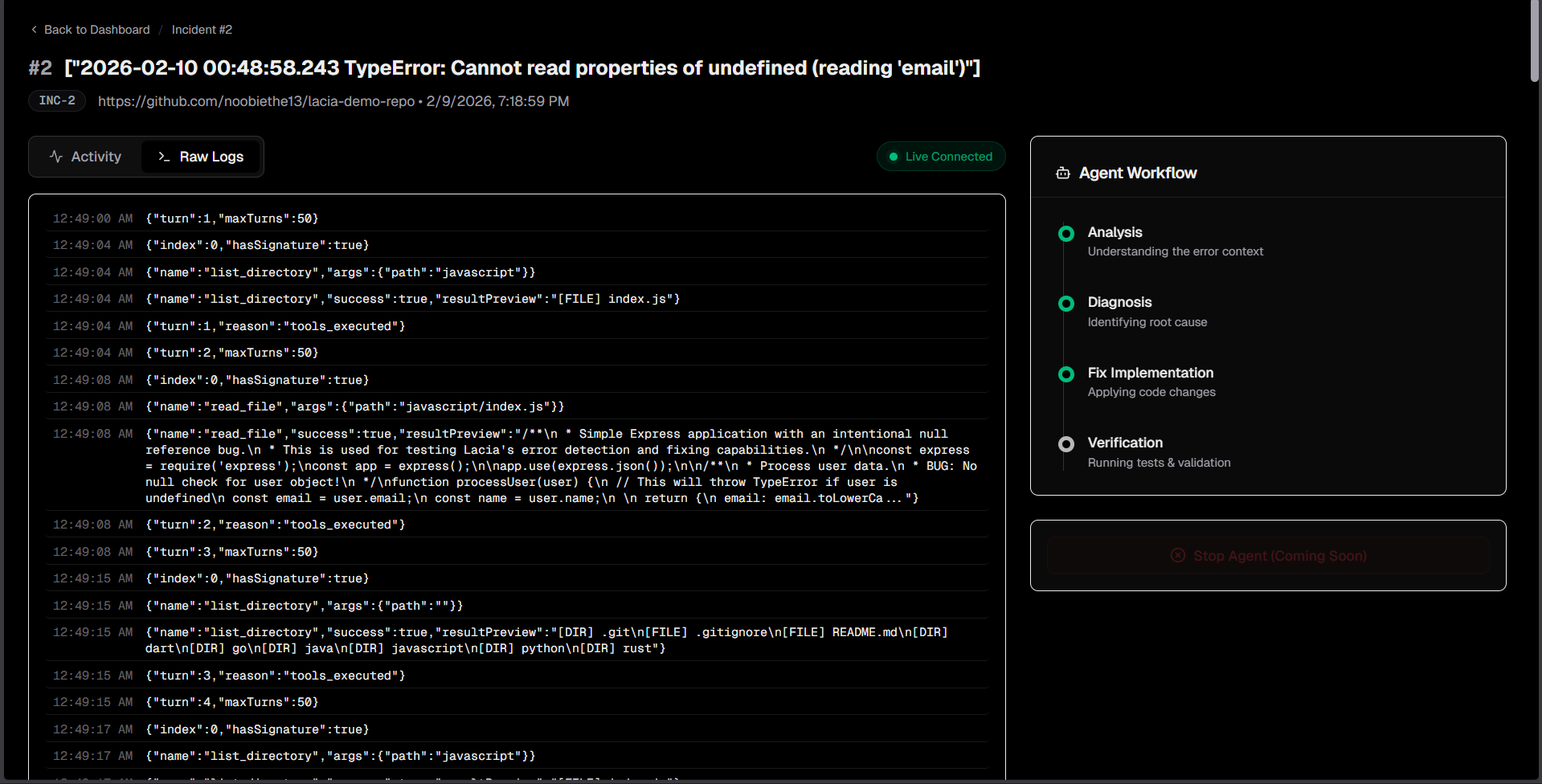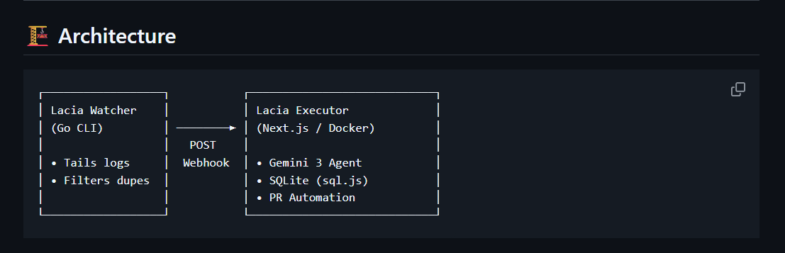 Lacia is a self-hosted Autonomous SRE Agent that sits between your production logs and your repository.