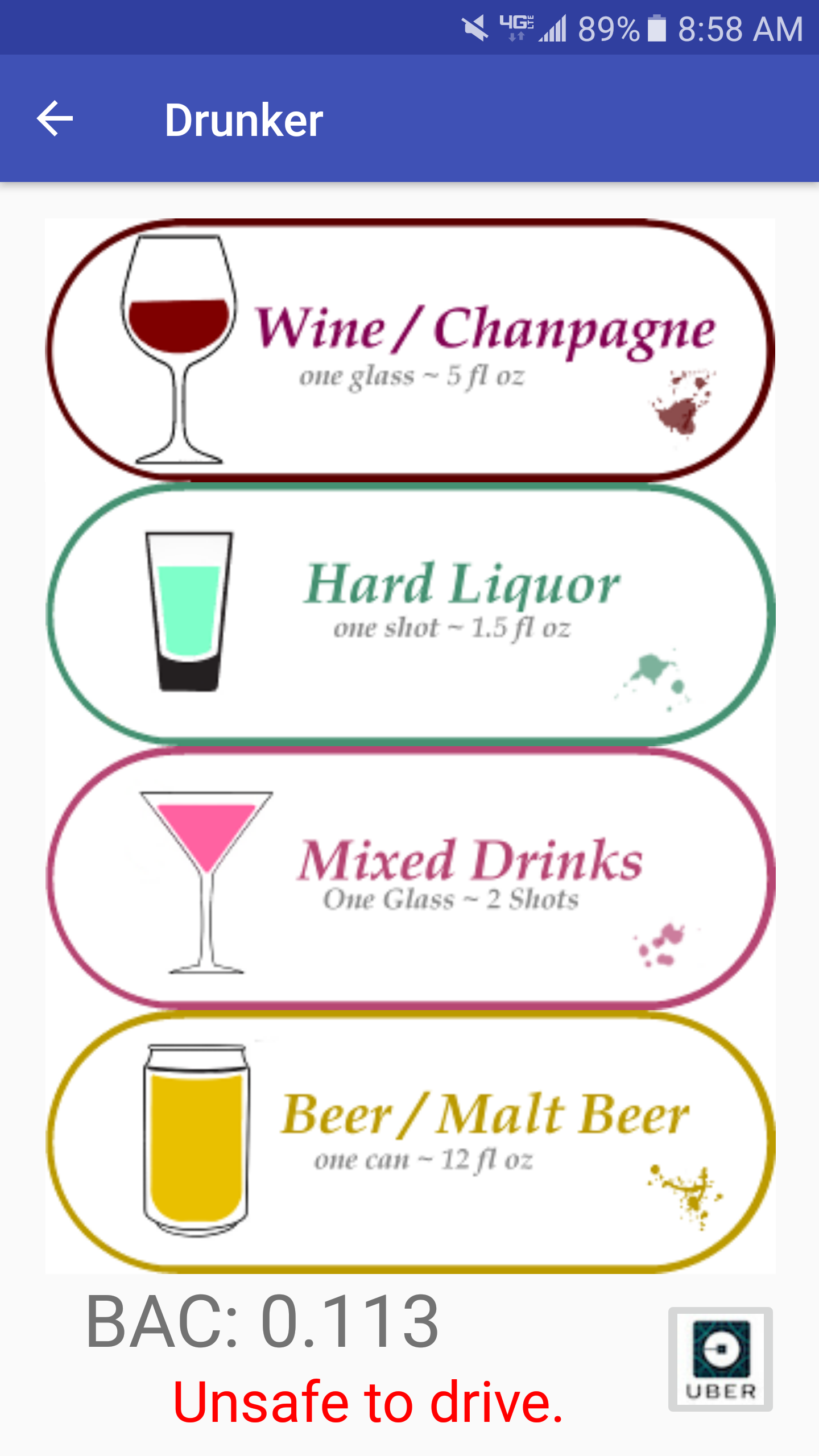 Drunk driving is definitely a problem in the United States. Many people are unaware that they are at risk simply because they "don't feel drunk". We created an app that tracks your BAC. Every time you take a drink, just select one of the options and your BAC will be updated. At the end of the night simply check the app and you'll know if you are safe to drive. If not, the app will indicate "unsafe to drive" and a button will automatically take you to the Uber app for a safe drive home.
