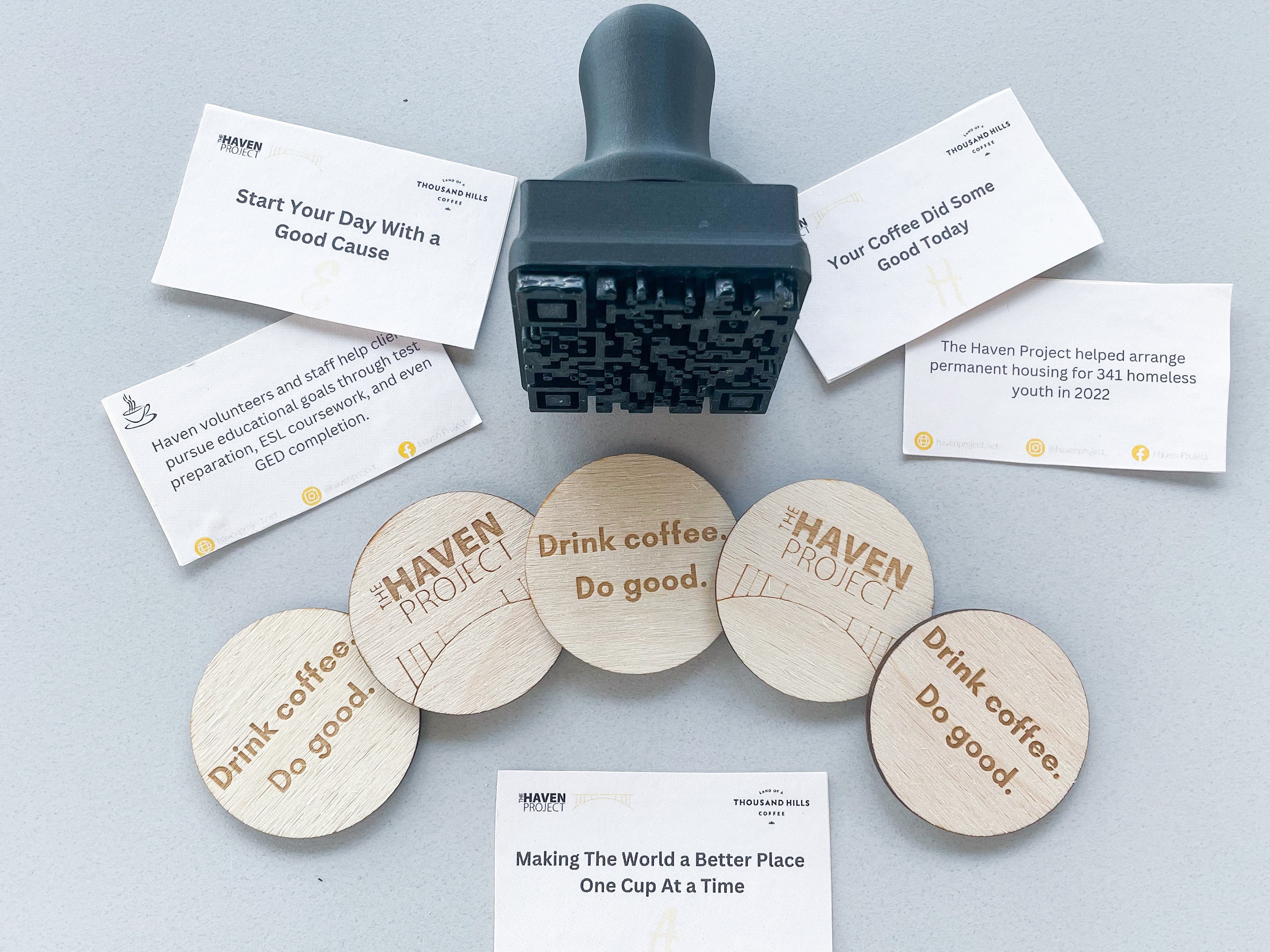 We created 5 unique, collectible cards that can be handed out by the cafe with purchases above a set amount. One side of the card contains a catchy one-liner connecting the coffee and impact (e.g. “Your coffee did some good today”). The other side is printed with a content-drive message that conveys a direct impact and describes work being done by Haven (e.g. “Haven helped arrange permanent housing for 341 homeless youth in 2022”)