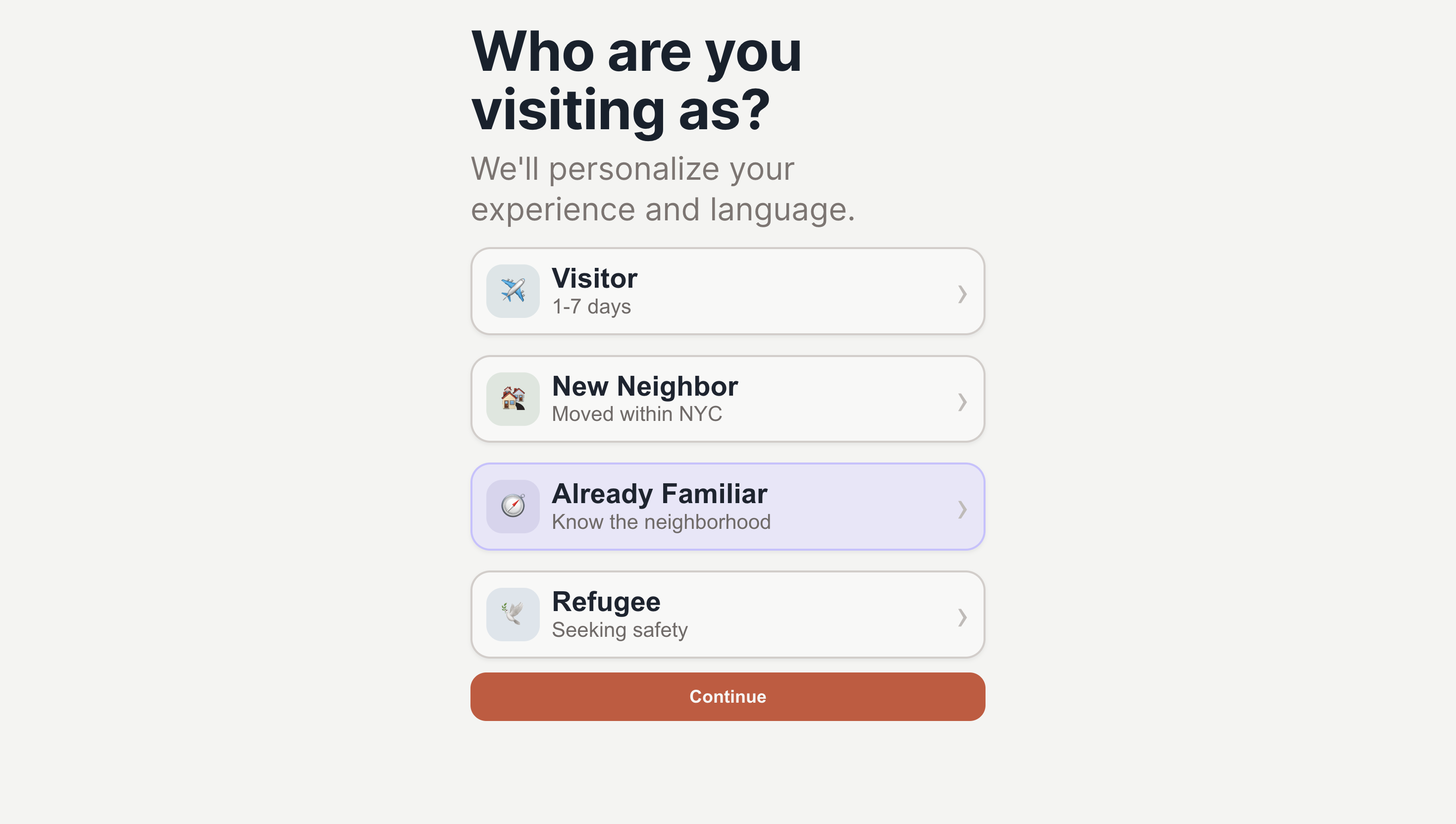 2. Personalization without profiling We wanted to surface the right content without making users feel surveilled. Asking "what is your immigration status?" felt invasive. We redesigned the onboarding to ask about needs instead of identity — letting the persona emerge from what someone is looking for, not who they are on paper.