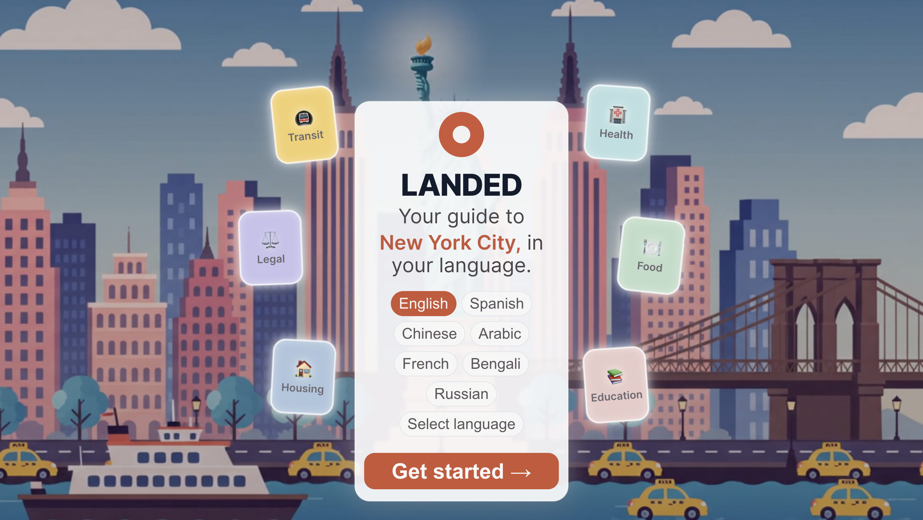 Landed is a free, multilingual, mobile-first web app that gives NYC newcomers a personalized guide to getting settled — in their language, for their situation.