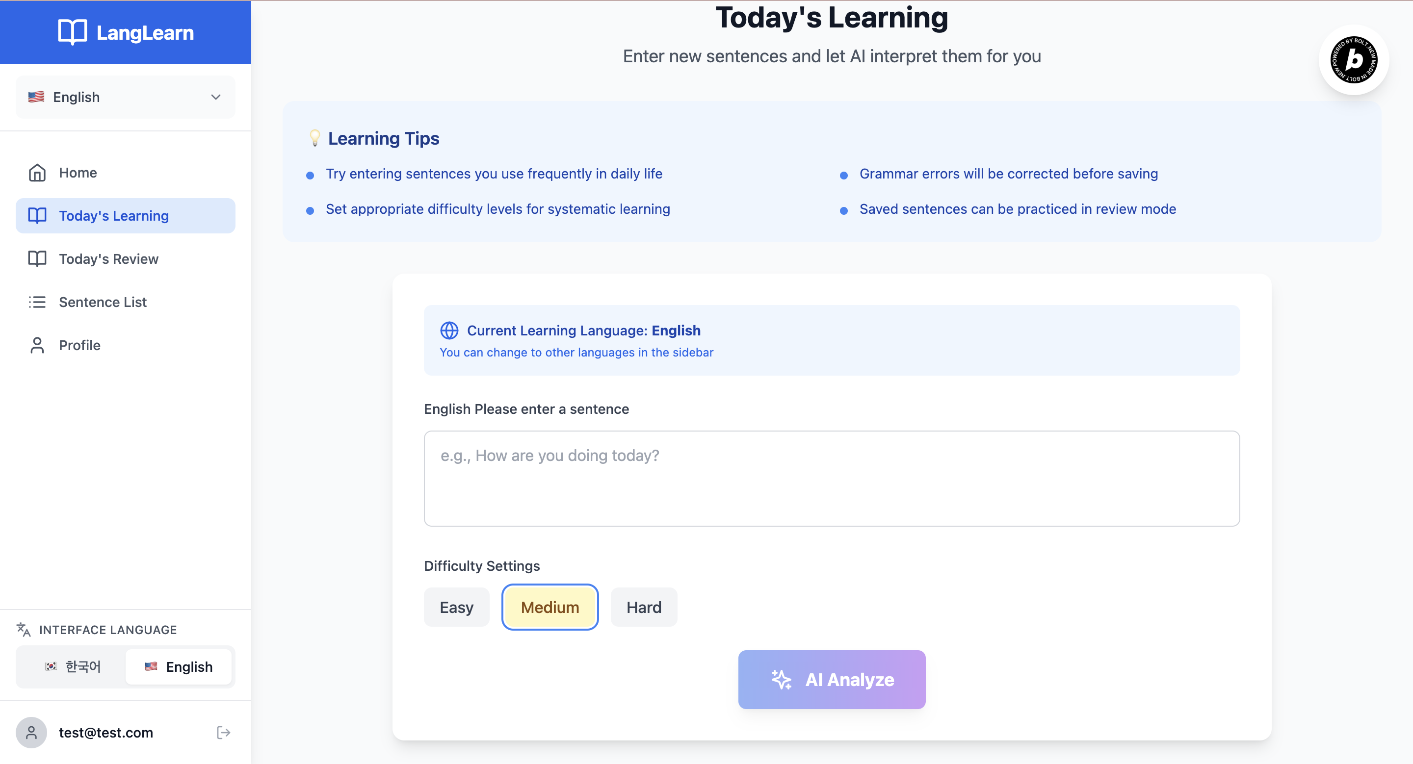 Users can add and save sentences they want to remember. AI analyzes each sentence for correctness.