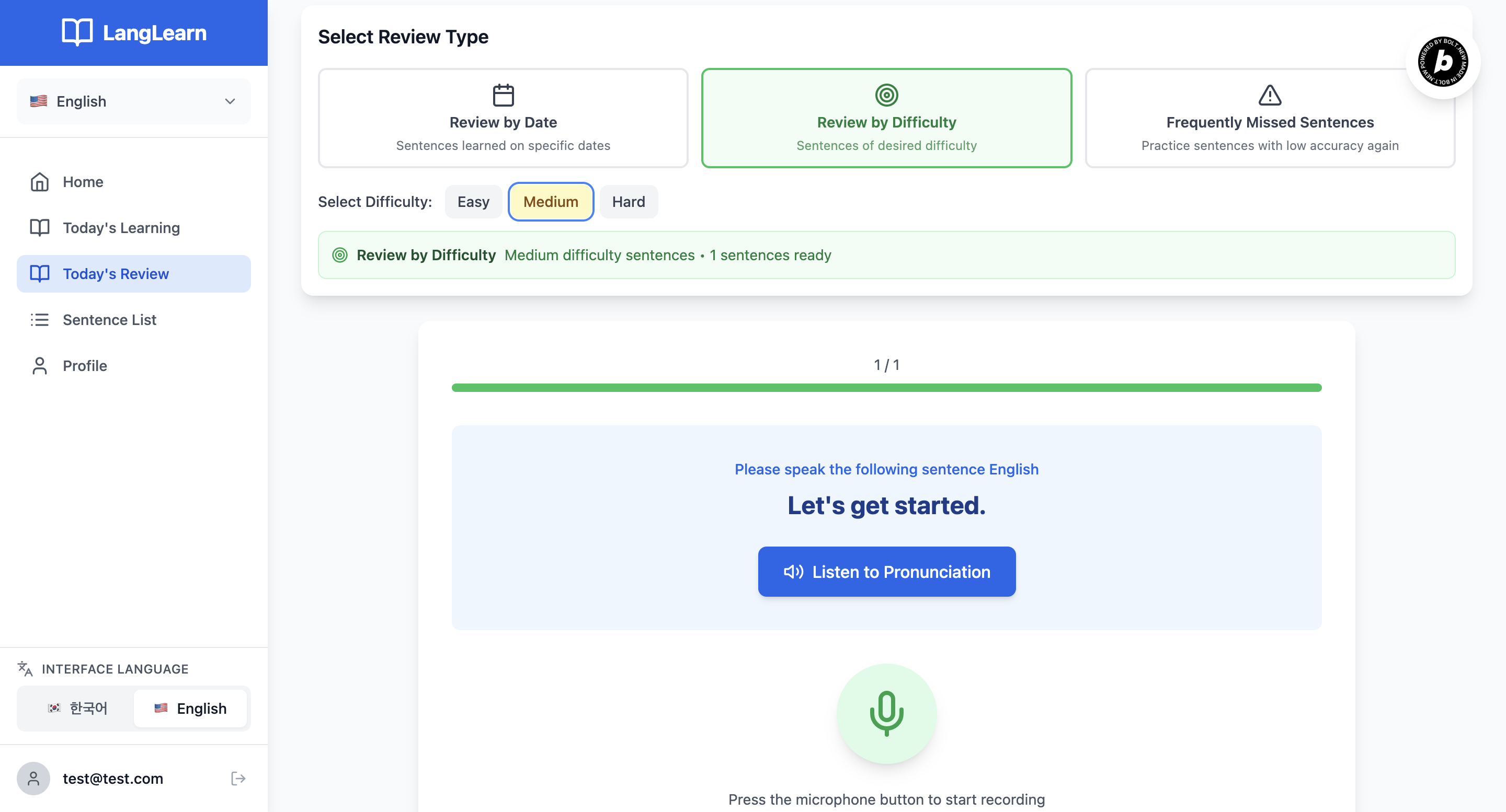 Users can choose from three review types to practice saved sentences. AI evaluates pronunciation and sentence fluency through voice input.