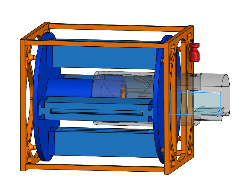 In the above picture, the central drawer is shown as translucent. This allows us to see the inside of the mechanism. We have carefully designed a series of curves inside the drawer. These curves rotate the entire blue magazine assembly by exactly 1/4 revolution, every time. This is a very reliable design, relying only on mechanical design, there are no electronics. For the finished product, we would like to have more magazine categories, and so we would change the mechanism to rotate less with each push making it more reliable.