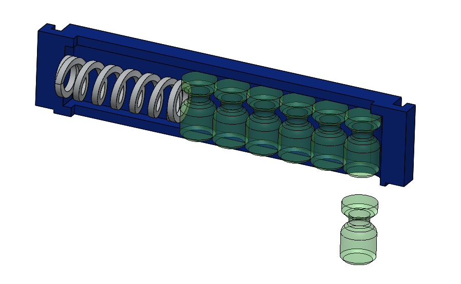 Notice that at the end of the magazine, there is a hole for a vaccine to fall through. This can only happen when the hole in the central drawer, the grey piece in our images, aligns with the magazine. This allows a vaccine to fall down into the drawer.