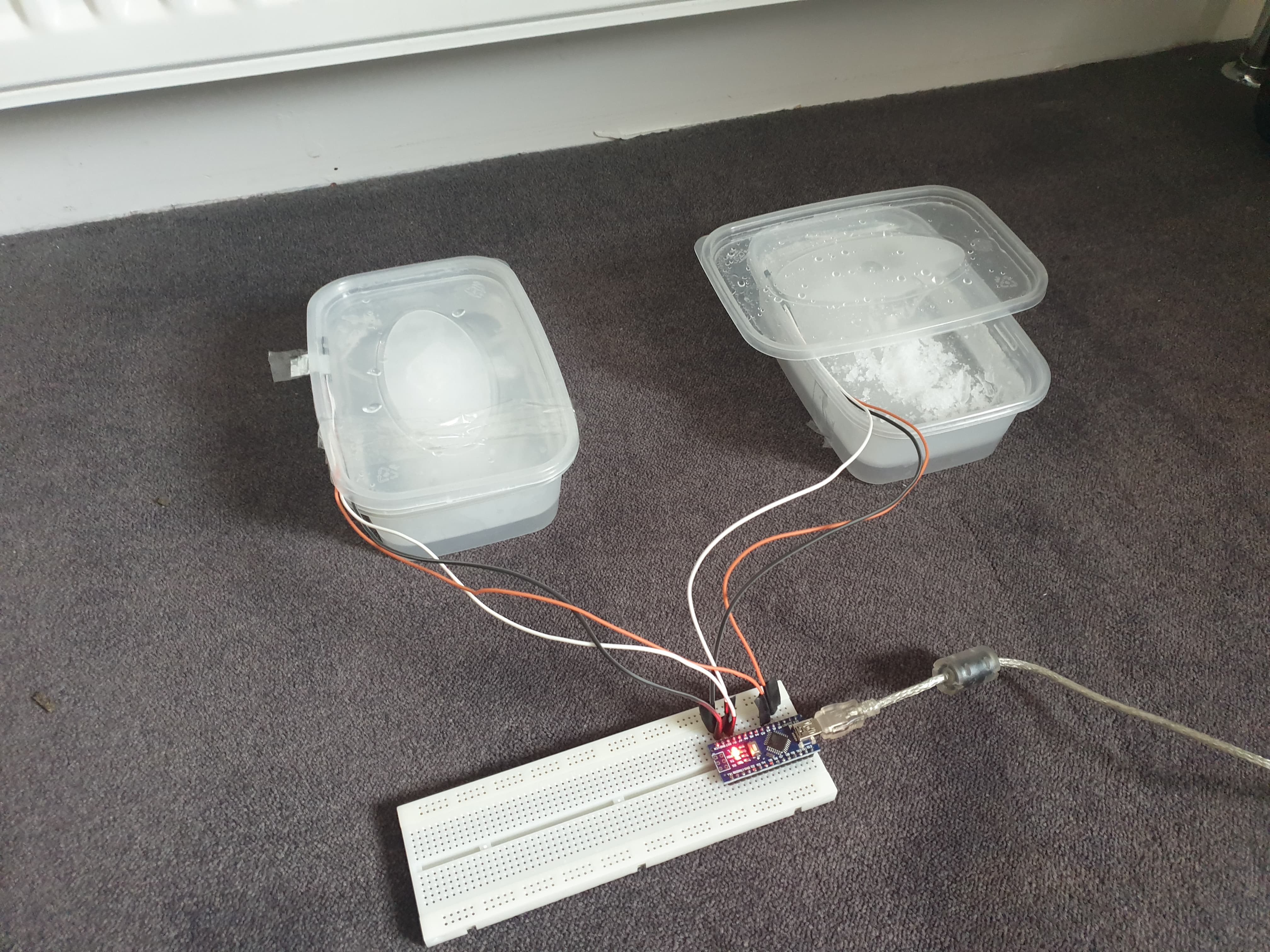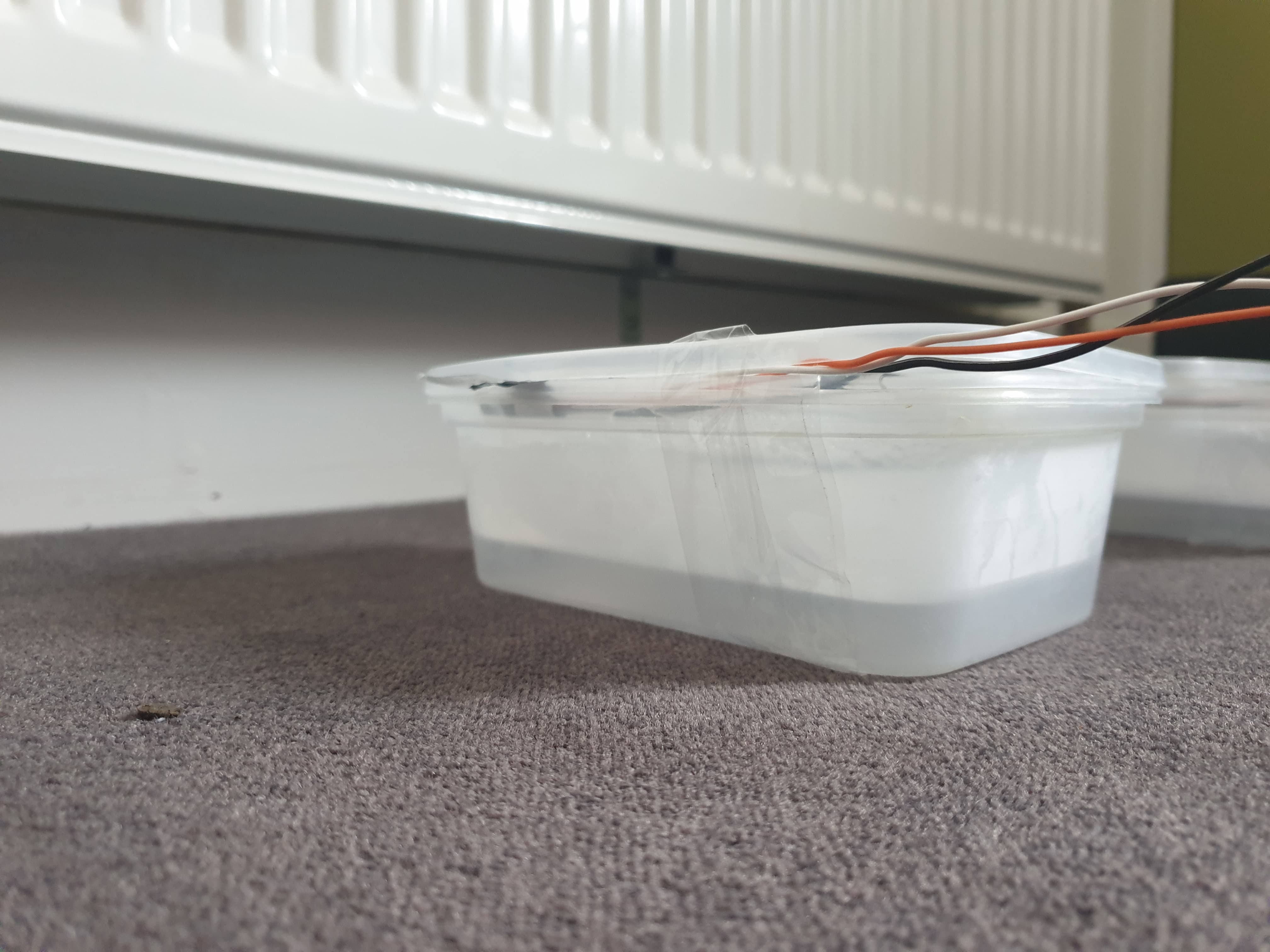 Opening and closing lid does not poses great threat as there is not much heat exchange in such a quick process, however it has been reported that in some areas, due to humans’ factor error, lid gets open and will stay open for a longer period, disposing vaccines to the sun radiation, and heat exchange with the atmosphere, where temperature can reach up to +35 or more degrees Celsius. This makes vaccinations spoiled. To prove the importance of the lid being shut, we have performed an experiment. Experimental results: The experiment was performed on two insulated tupperwares with frozen water. The experimental setup is shown in figure 5. Two different size tupperwares were used in order to create an air gap between each other, creating insulation. One Tupperware was kept closed and another was half open, to understand better the difference in heat exchange, between open and closed vaccination carrier.