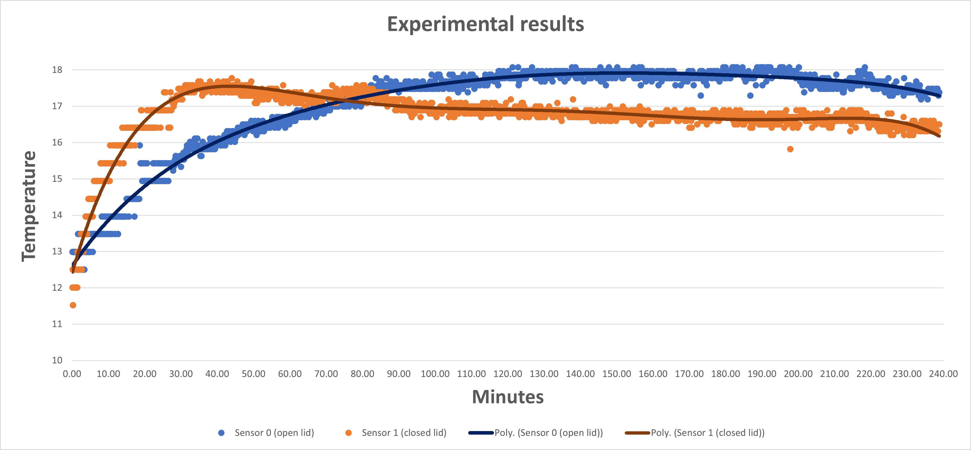 Collected data is presented in figure 6. It is visible that open lid container is first colder than the closed lid container, however in the long run the closed lid container shows better results at keeping cool temperatures. It is visible from the shape of the orange graph that it experiences the higher increase in temperature at the beginning, which is unexpected. The error might come because the sensor might be touching the lid, so it takes more time to cool down the temperature. Even though the difference is only in few degrees, it is worth mentioning, that the room temperature is a lot cooler than that on the field. Using the same sensor, the room temperature is taken to be 23 degrees Celsius, whereas field temperatures can reach up to +40 degrees Celsius.
