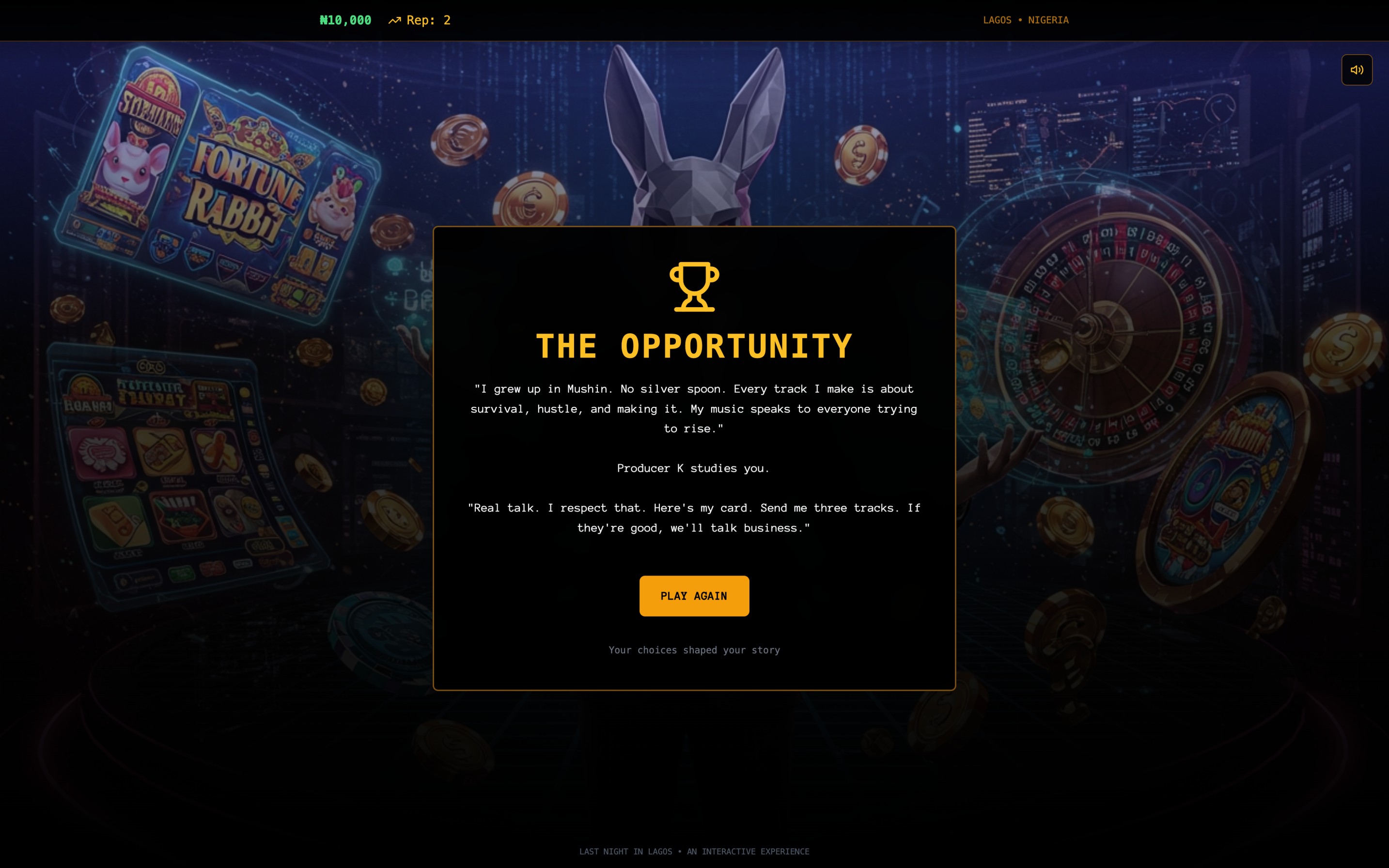 By the end, players experience one of multiple outcomes: — Dami blows the producer away and gets the break he’s dreamed of — He arrives too late, and the chance slips away — He discovers hidden truths about the people around him — Or he realizes the night was about more than a career, it was about who he is becoming