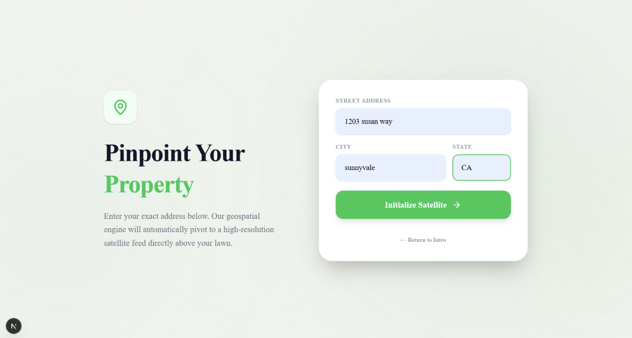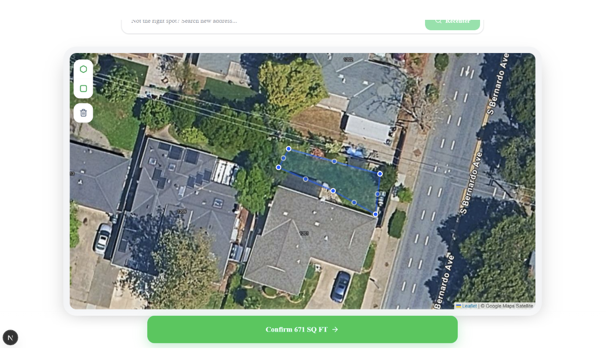 Users input their address and draw one or more polygons directly on the map to outline their exact lawn. Our AI-powered system then: