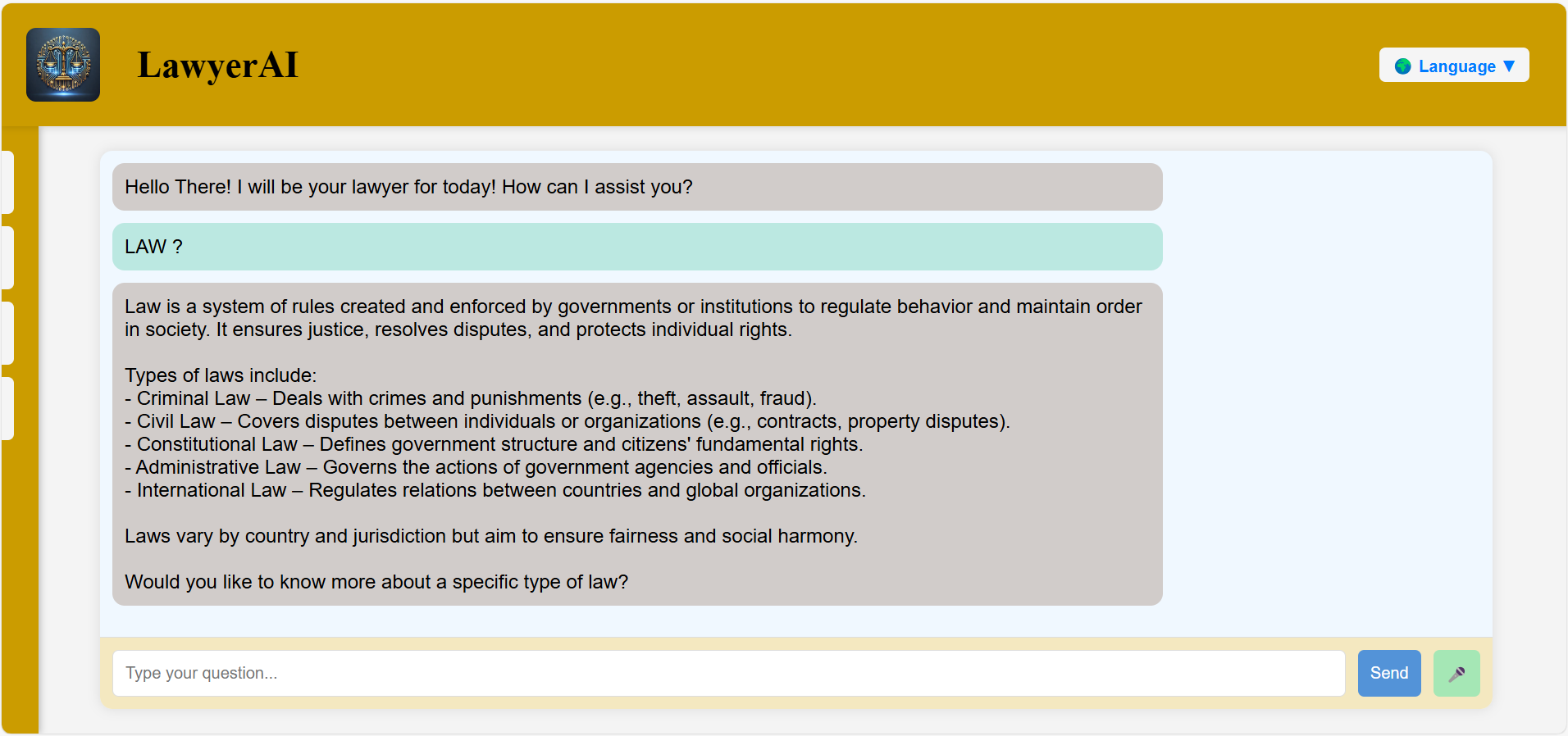 To address these challenges, LawyerAI serves as an AI-powered legal assistant that helps users: 🔹 Understand their legal rights based on Indian laws. 🔹 Find relevant legal information in a simple, easy-to-digest format. 🔹 Receive guided assistance on legal actions, including information on government authorities and legal aid services. 🔹 Use voice-based interaction for users who may struggle with text input. By making legal knowledge more accessible, LawyerAI ensures that people can make informed decisions and protect themselves from legal exploitation.