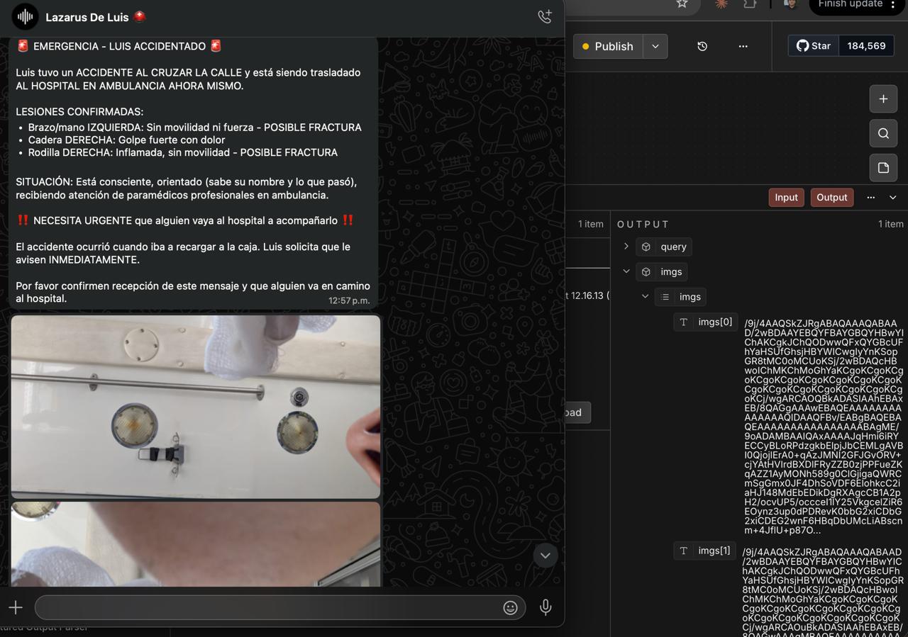 Emergencia — la IMU del wearable Lazarillo detecta impactos físicos. YOLOv8n-pose confirma la caída analizando keypoints corporales en el tiempo. El sistema avisa al usuario y espera diez segundos. Sin respuesta: Gemini genera el resumen del incidente, ElevenLabs lo convierte a audio, y Twilio llama al contacto de emergencia reproduciéndolo junto con la ubicación del usuario. Automáticamente. Sin que el usuario haga nada.