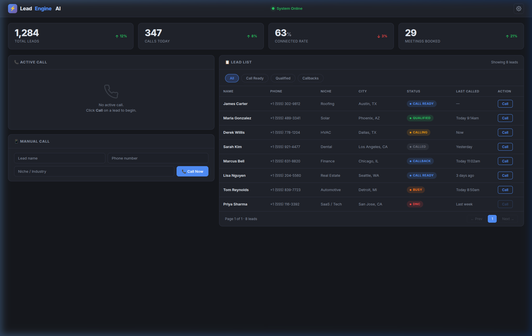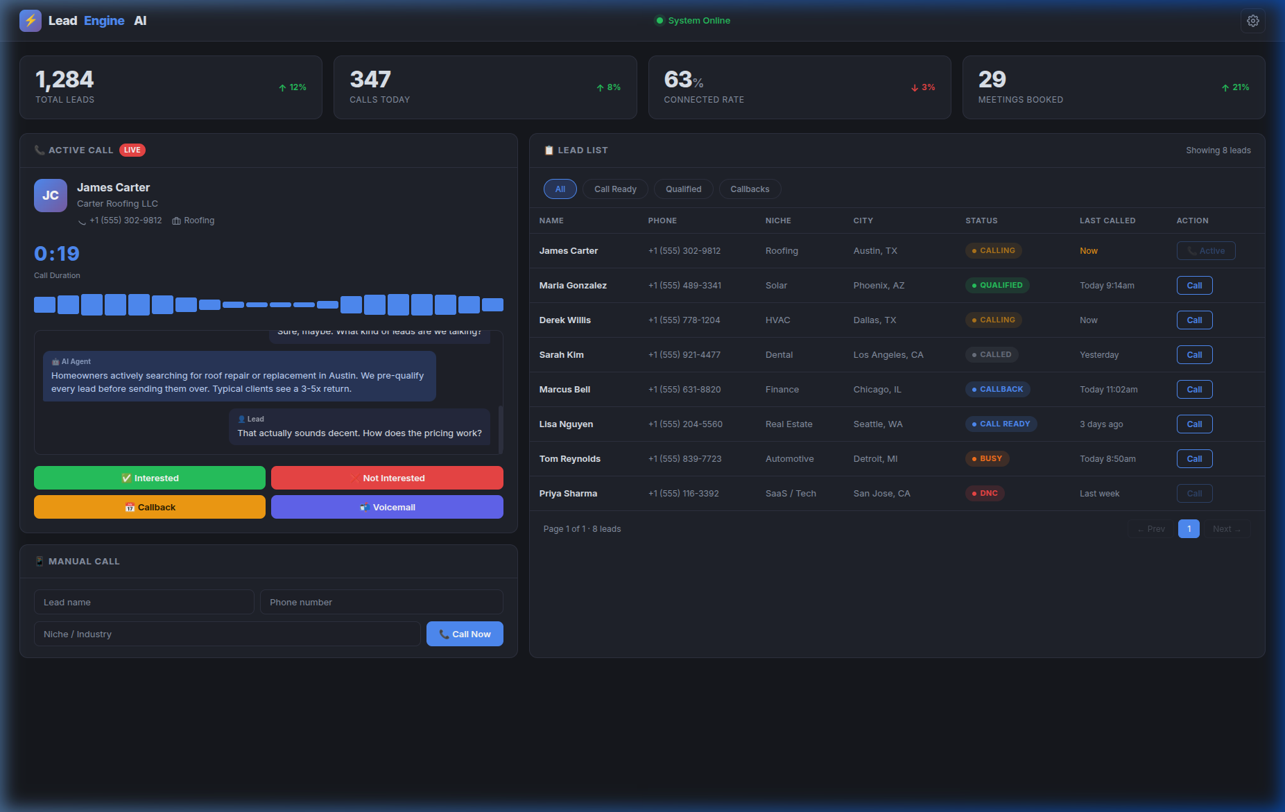 A full call center dashboard provides live call view, real-time transcript, outcome buttons, lead filtering, and manual call triggering.