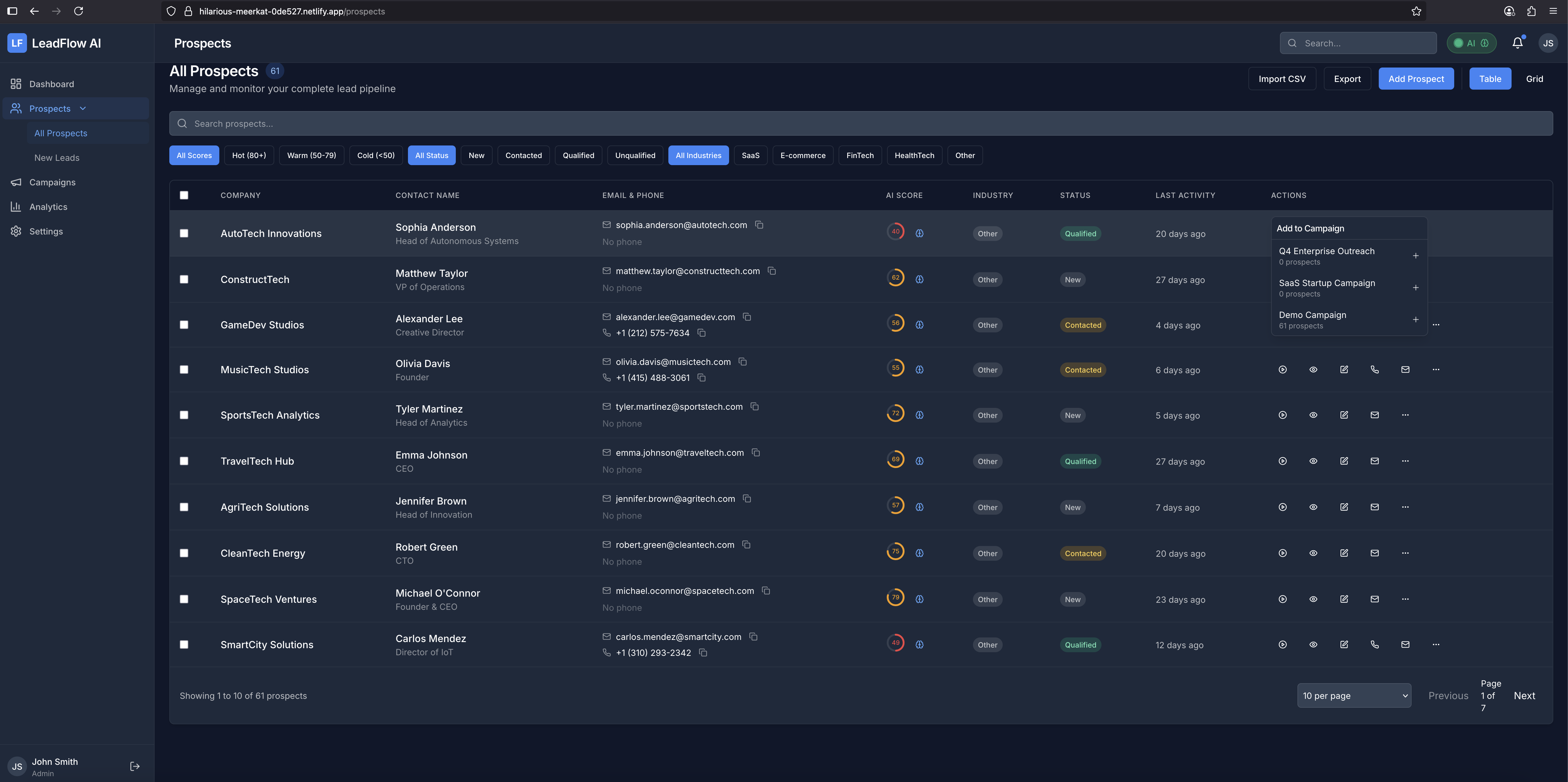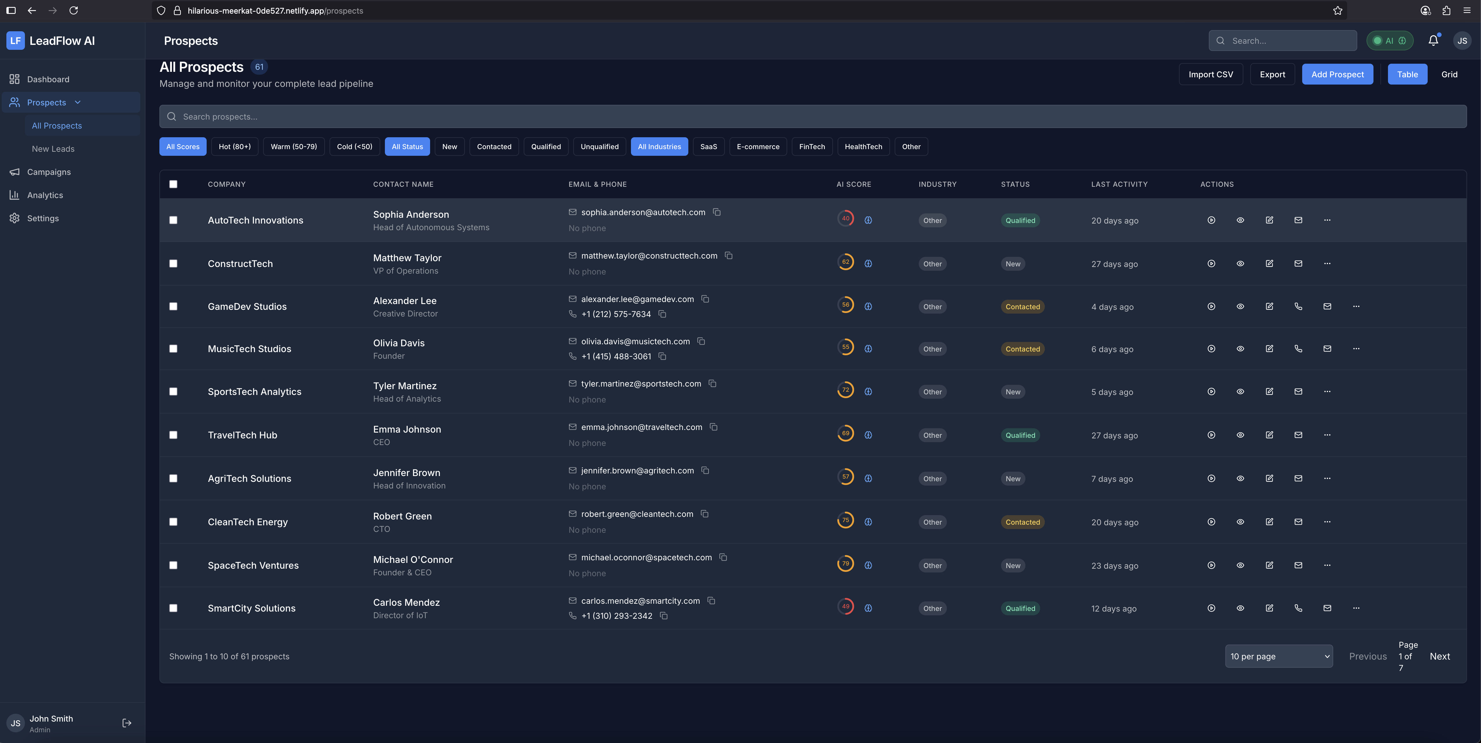 LeadFlow AI automates lead management with AI-powered scoring, qualification, and follow-up recommendations. The platform features: