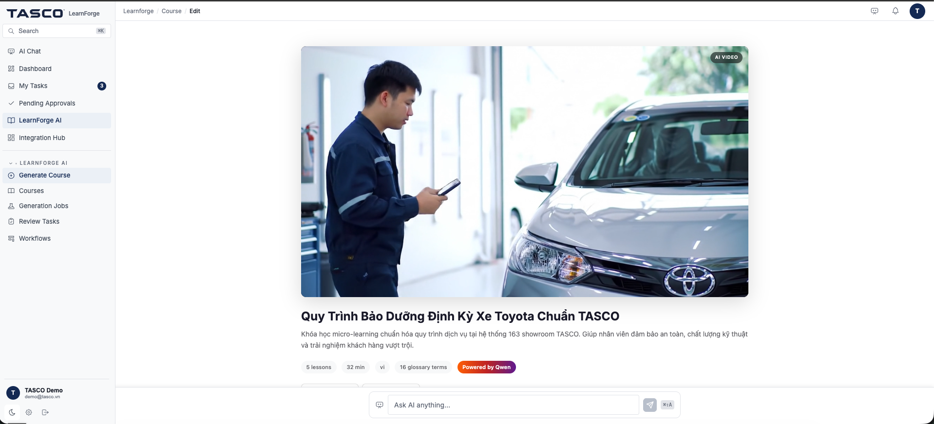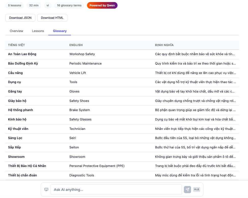 TASCO's L&D team expressed a clear need: they are "hungry for quality, engaging content" and want to digitalize their entire training operation. We saw an opportunity to use Qwen AI to transform how automotive industry training content is created, delivered, and consumed.