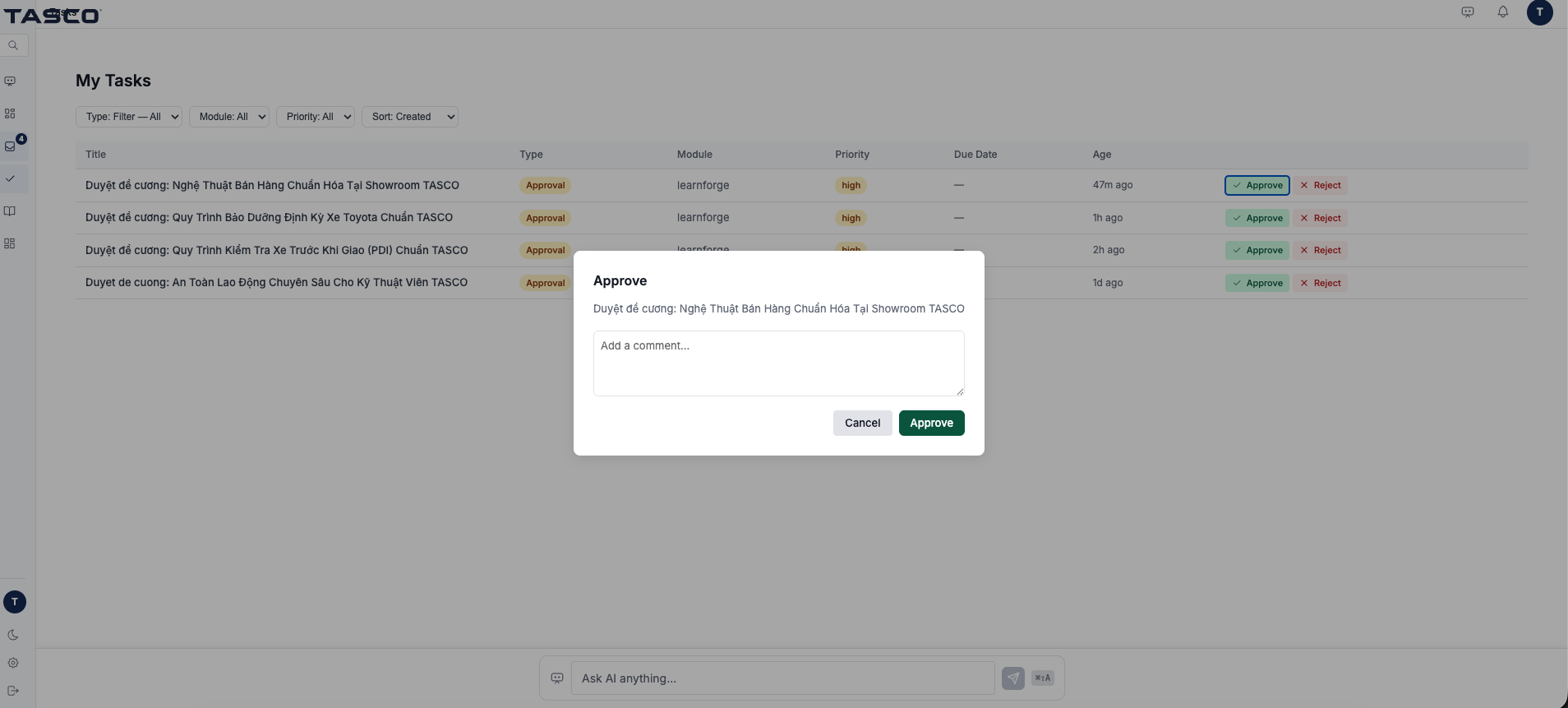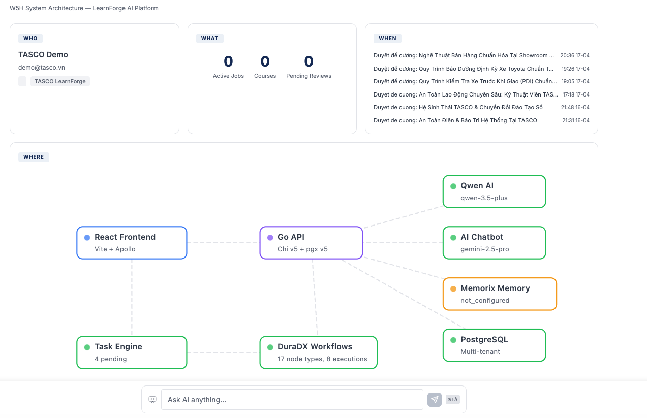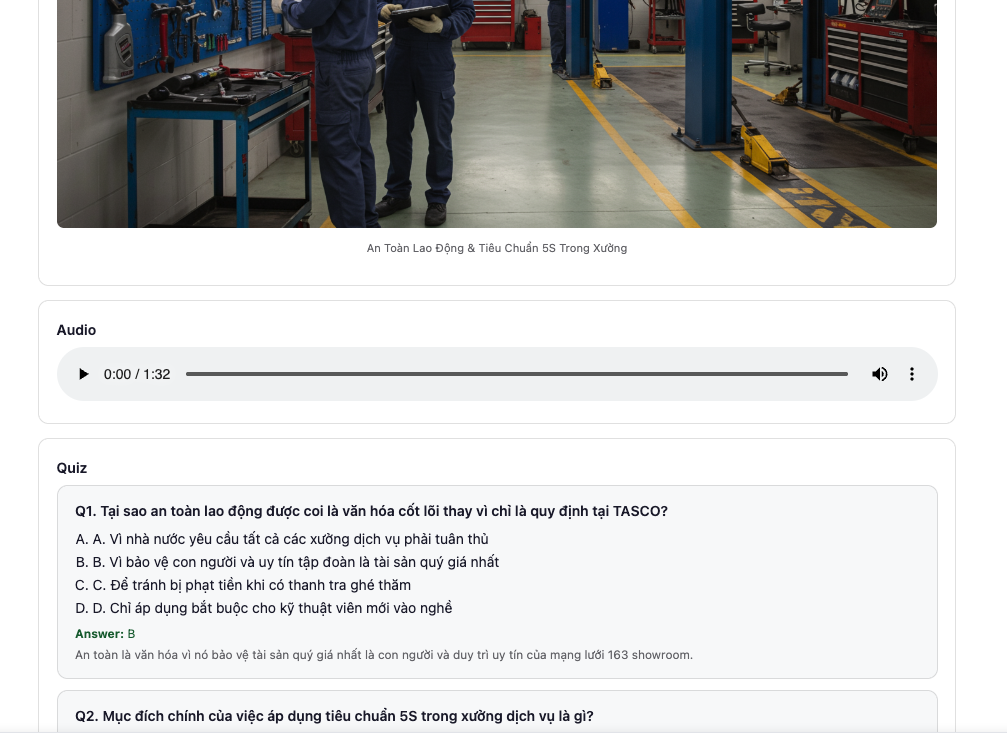 TASCO, Vietnam's leading mobility and automotive ecosystem, operates 163 showrooms selling 40k+ cars annually across 16 brands, with 4.1 million car owners on their VETC toll collection platform. Their 10,000+ employees need up to 20 hours of training per year, but the current approach relies entirely on traditional offline classrooms — long sessions that are hard to scale, difficult to update, and impossible to standardize across a nationwide workforce.