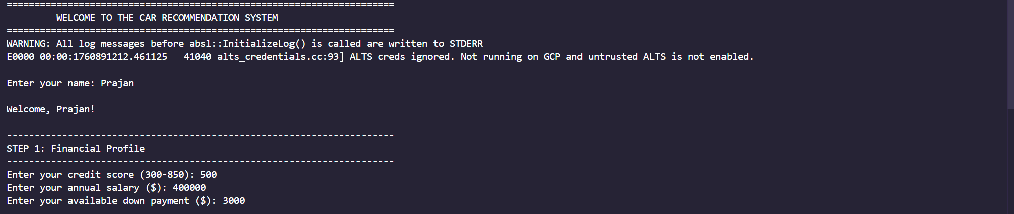 It takes in financial details of a customer, then the customer takes a quiz and then using a database with over 20 car brands it recommends different vehicles and if they should be leased or financed.