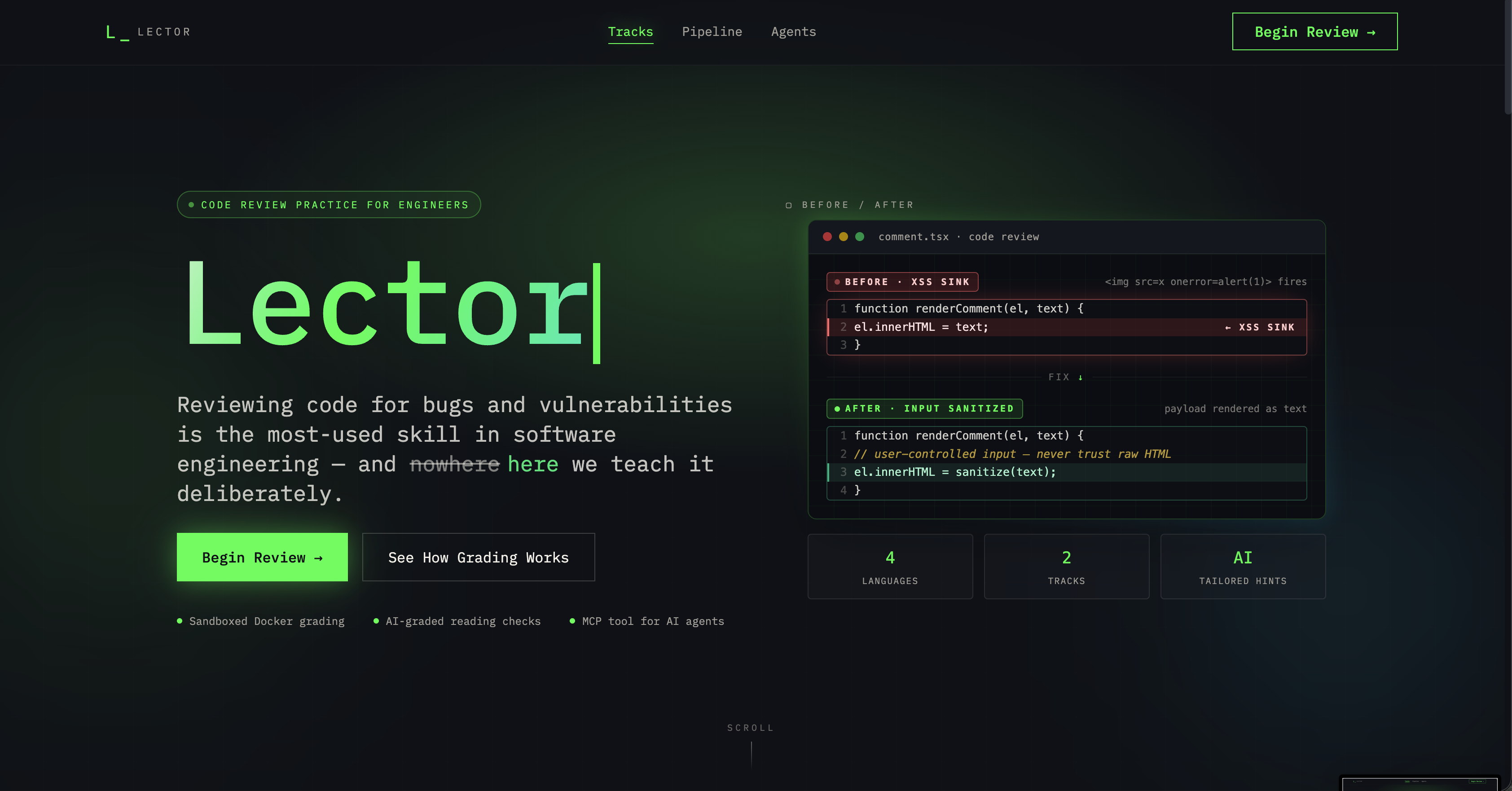 - Most importantly, Lector does not grade based on surface-level pattern matching. It verifies solutions by actually running code and checking whether the intended exploit or bug has truly been eliminated without breaking the rest of the application.