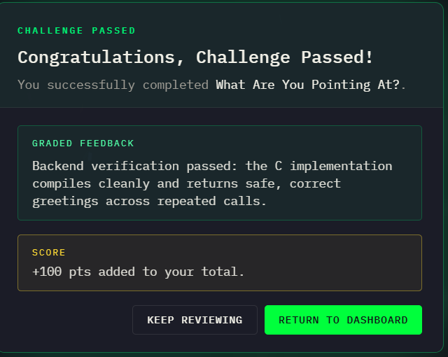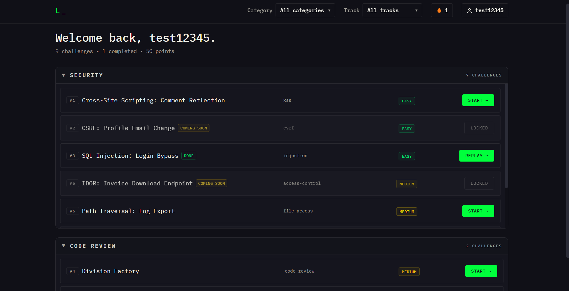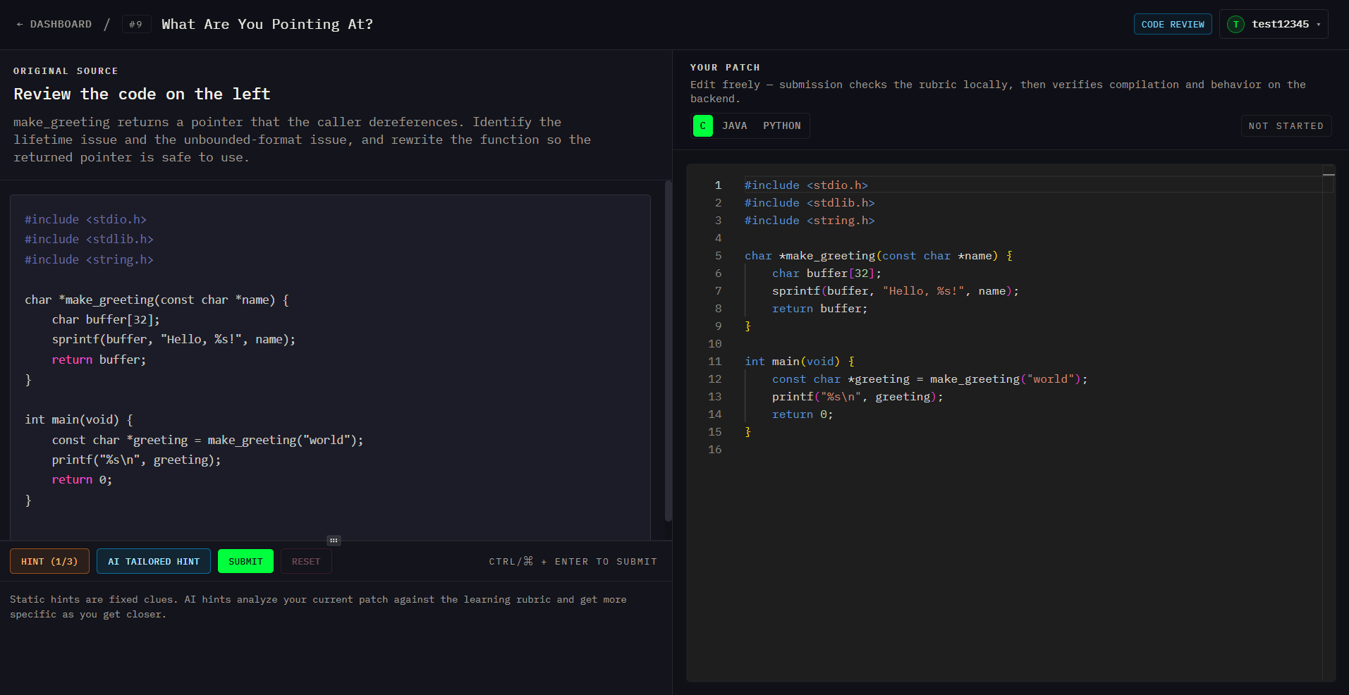 - In the code review track, users analyze buggy or risky code, identify what is wrong, and improve it so the behavior is correct and the implementation is safer and more robust. The platform provides guided hints, grading, and feedback based on what the user has tried so far.