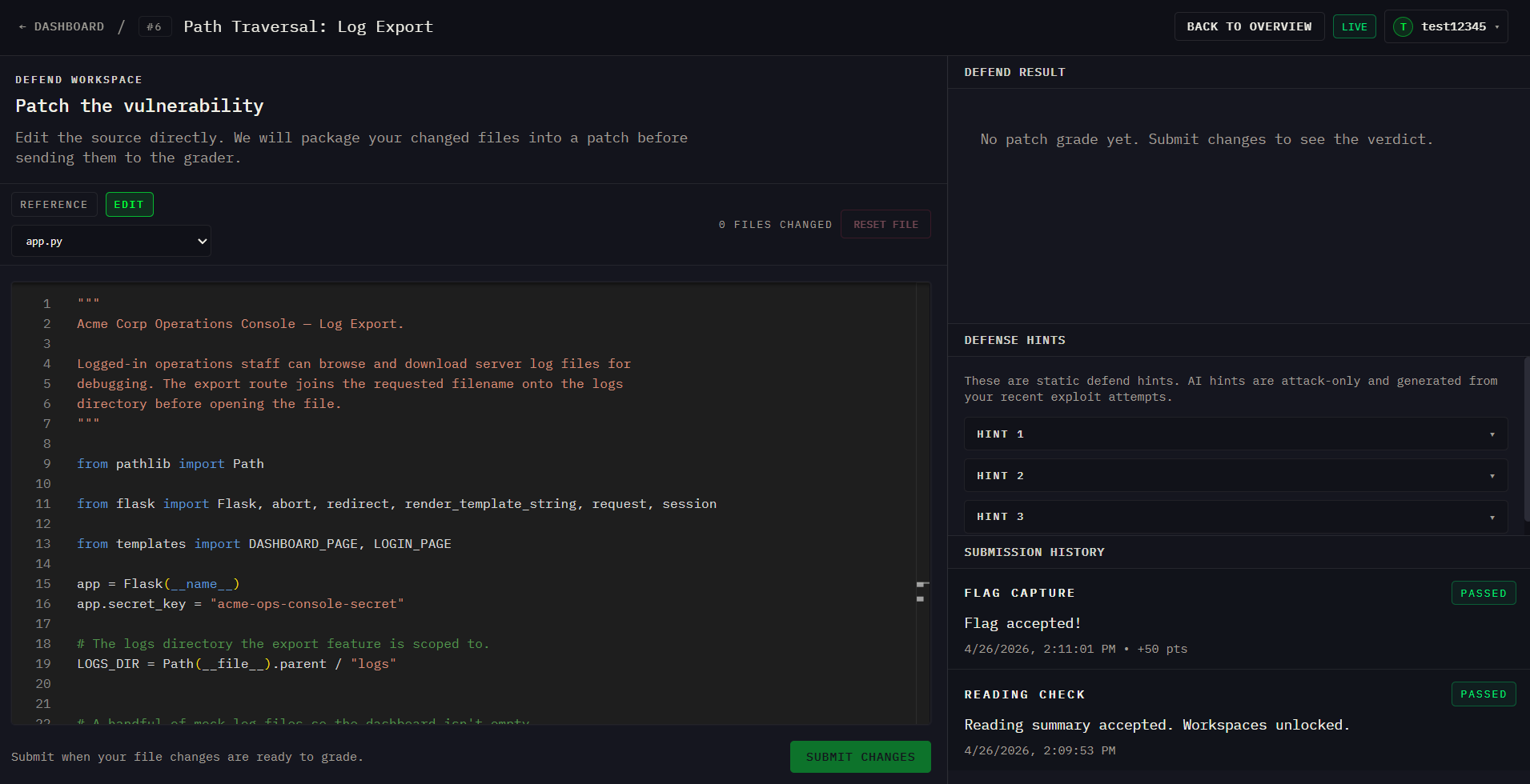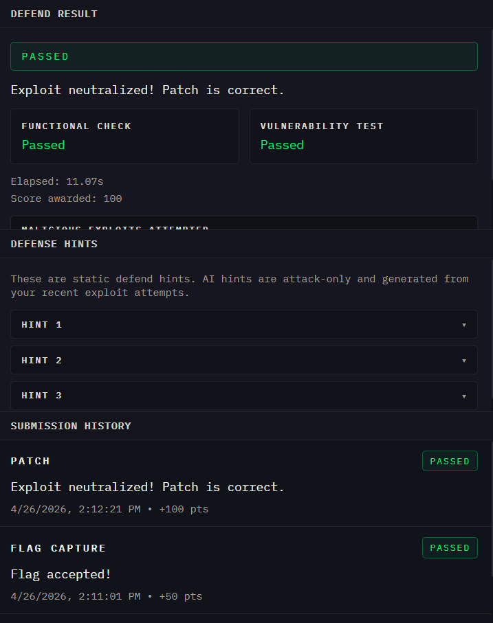 A major challenge was that we really wanted to make the grading meaningful. We did not want to accept solutions based only on string matching or shallow heuristics, so we had to build backend validation that checks whether user changes truly fix the problem. As such, we spun up and hosted containers for each security challenge when they were started, as well as restarting the apps using the users' supplied code fixes and running tests automating tests against the users patches and making sure the app still functions.
