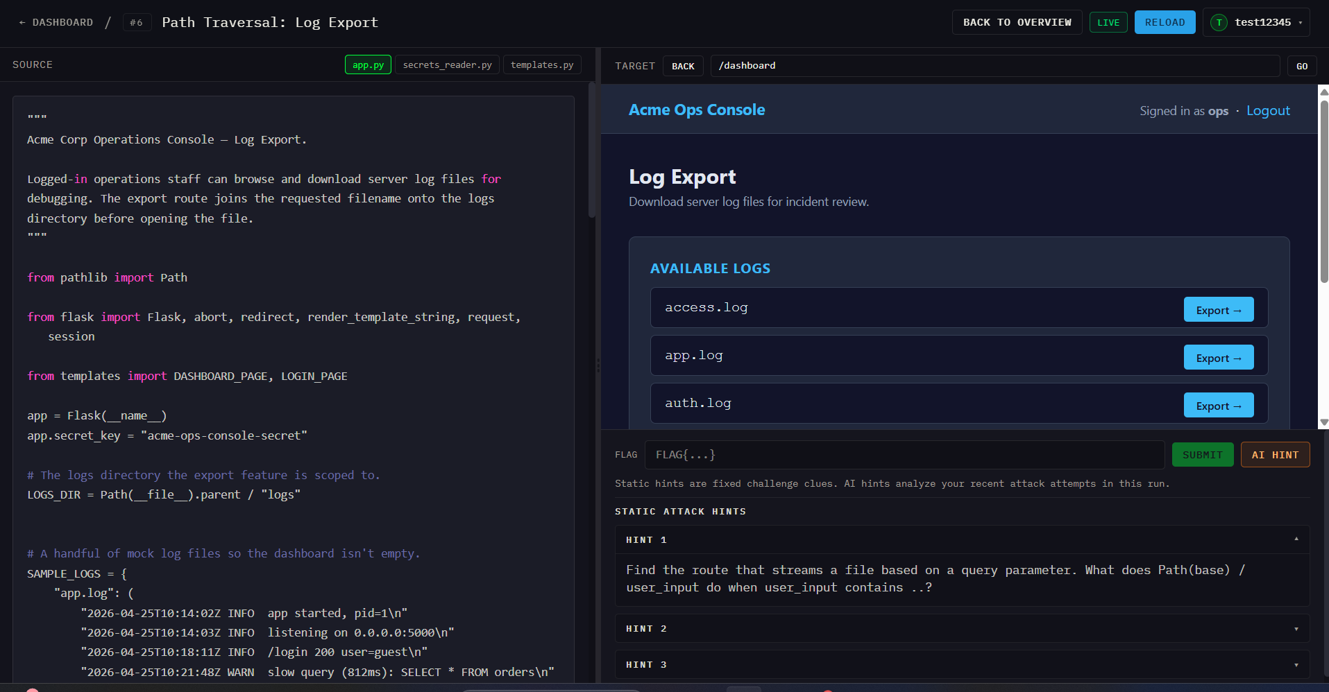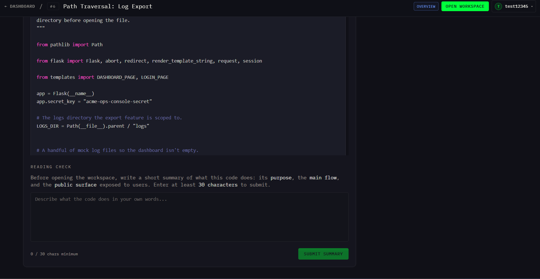 - In the security track, users inspect vulnerable code, exploit the flaw in a live sandboxed application, capture the flag, and then patch the vulnerability so the same exploit no longer works.
