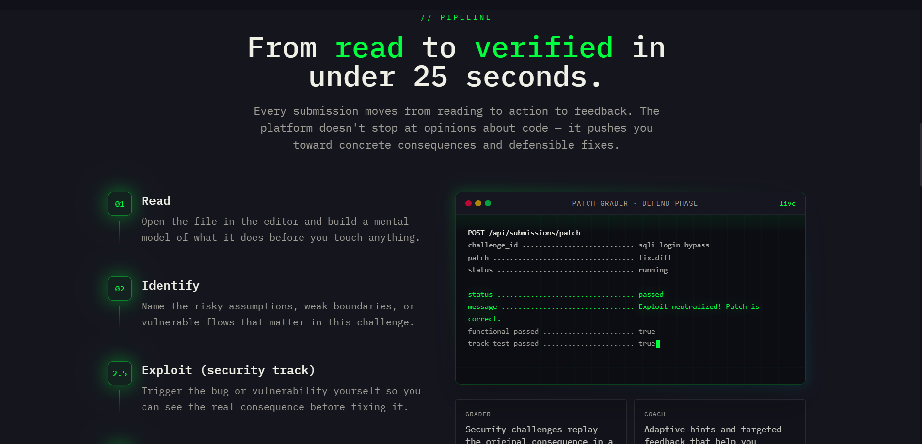 - For security challenges, we launch sandboxed containers for vulnerable apps, let the user attack them, then apply the user’s patch, restart the app, and verify that the original exploit no longer succeeds.