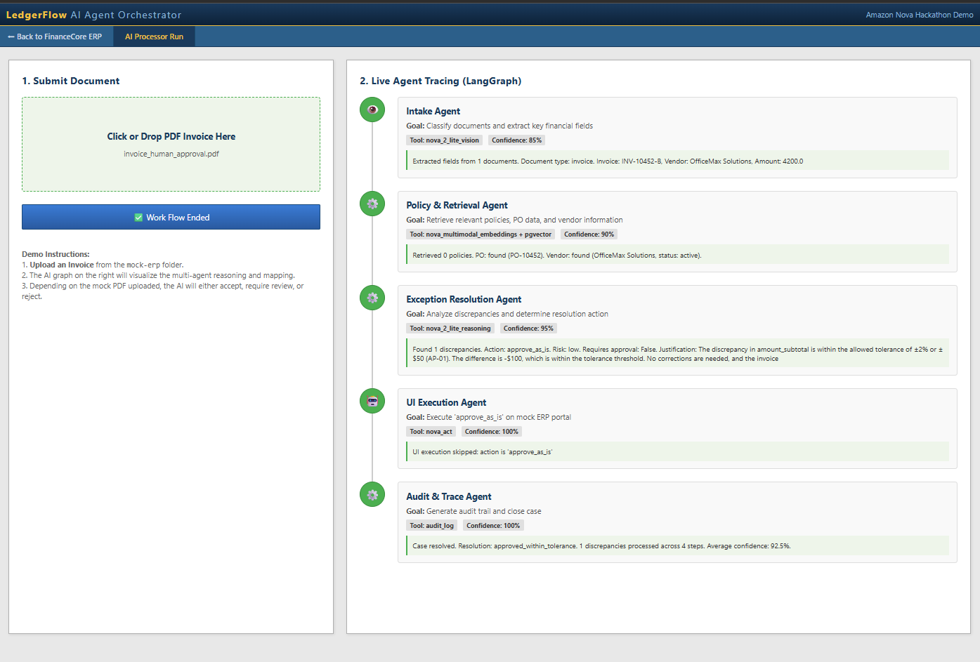 We built LedgerFlow AI to explore how Amazon Nova can transform this process from manual exception handling into an intelligent, auditable workflow. The idea was simple: instead of using AI only to analyze documents, we wanted to build a system that could understand evidence, reason over policy, ask for human approval when needed, and then take action inside a legacy UI.